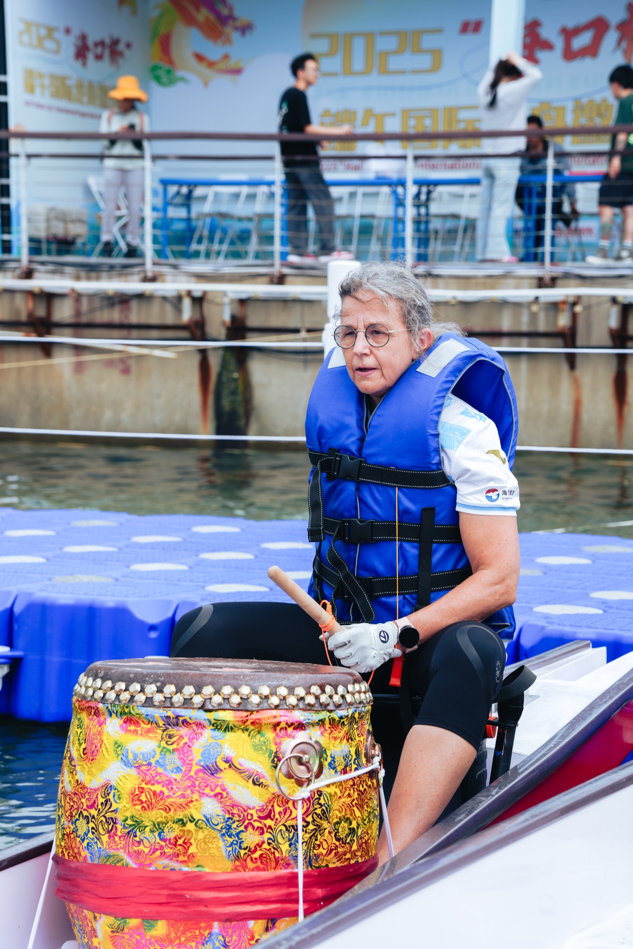 Catherine Cooke, principal of Yingya St. Peter's School, participates in the 2025 Haikou Cup International Dragon Boat Invitational as a drummer. (Photo/Jia Yin)