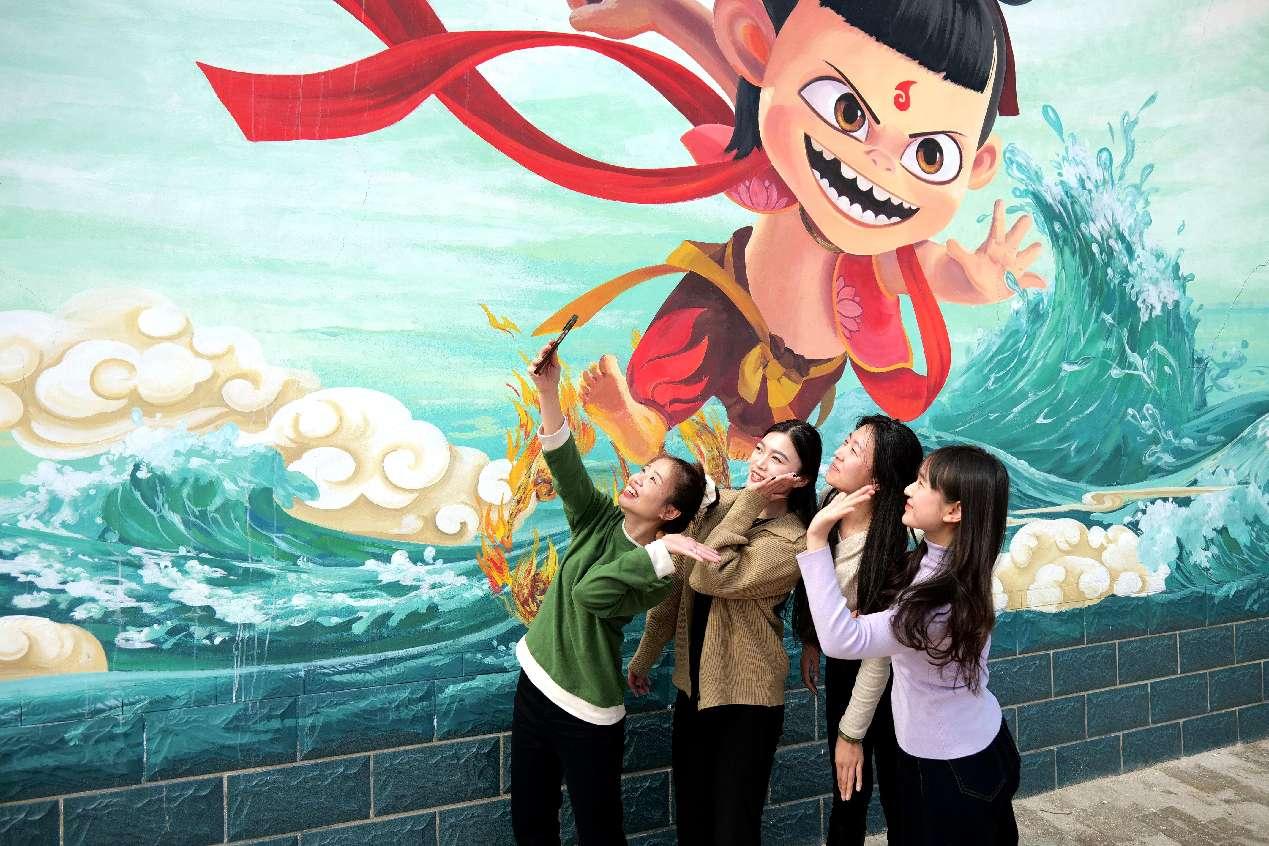 Several women pose for a picture in front of a mural depicting scenes from the Chinese animated blockbuster "Ne Zha 2" in Huimin county, Binzhou, east China's Shandong province. (Photo by Wang Jun/People's Daily Online)