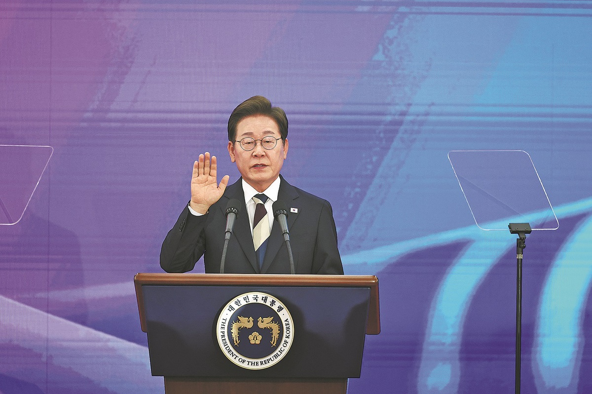 Lee Jae-myung takes the oath of office in the National Assembly building in Seoul on Wednesday during a ceremony marking his inauguration as South Korea's new president. (Photo/Xinhua)