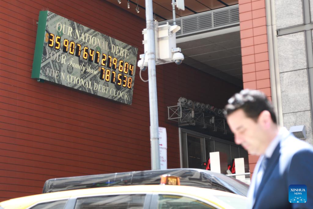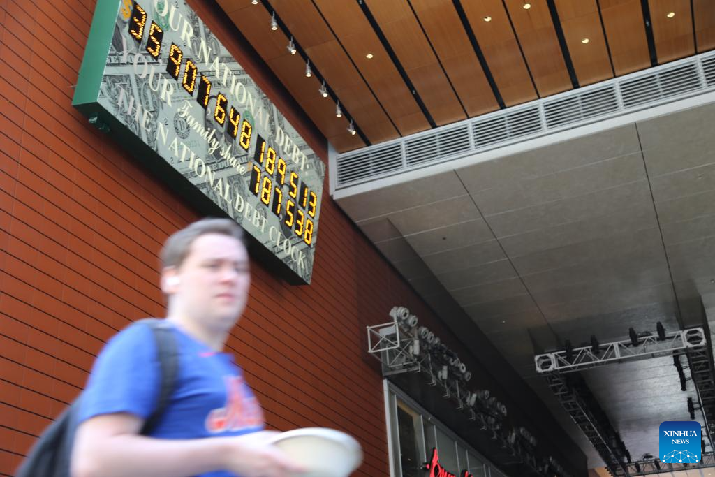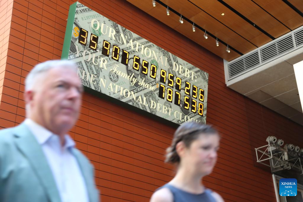 Pedestrians walk past the National Debt Clock in New York, the United States, on June 4, 2025. The U.S. nonpartisan Congressional Budget Office (CBO) released an analysis Wednesday predicting President Donald Trump's tax-cut bill will reduce taxes by 3.7 trillion U.S. dollars, which will add 2.4 trillion dollars to the country's deficits over the next decade. (Xinhua/Liu Yanan)