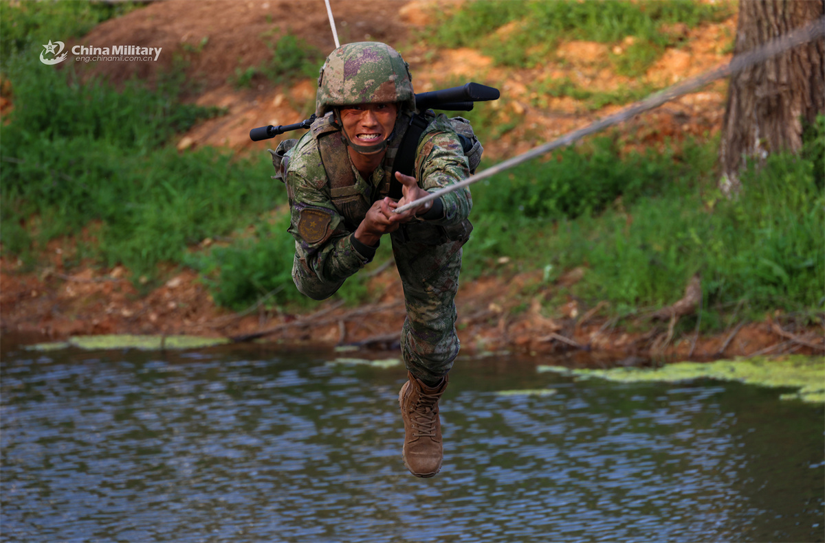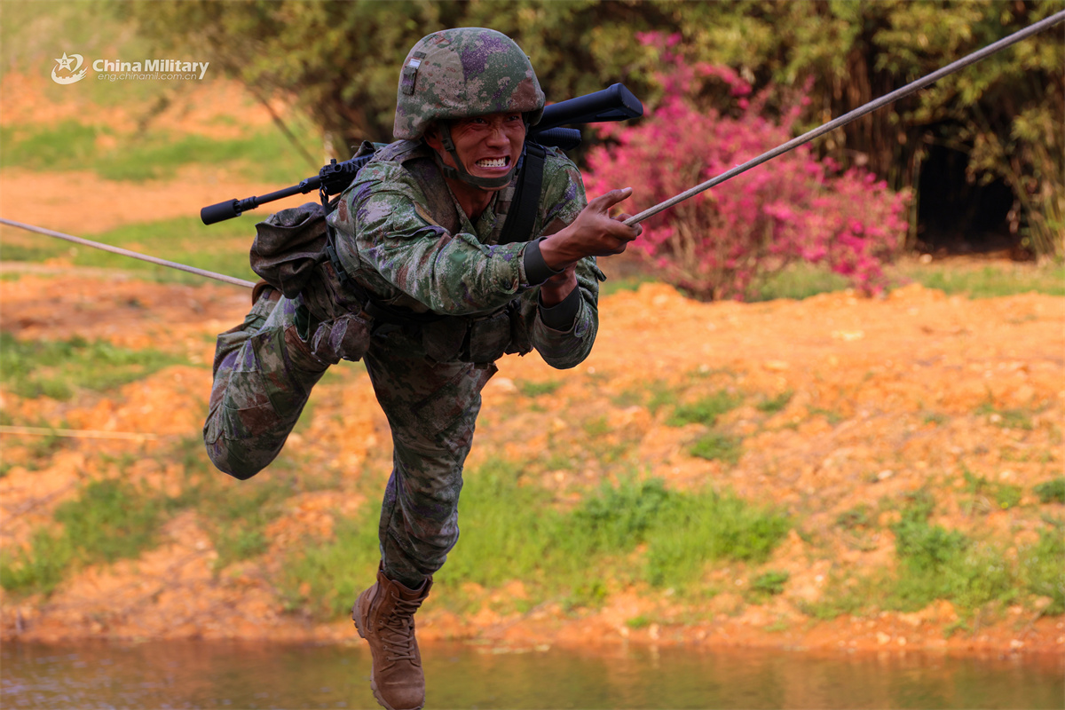 A soldier assigned to a brigade under the Chinese PLA 72nd Group Army uses the Army crawl to cross a one-rope bridge during a reconnaissance training exercise. (eng.chinamil.com.cn/Ma Hailin)