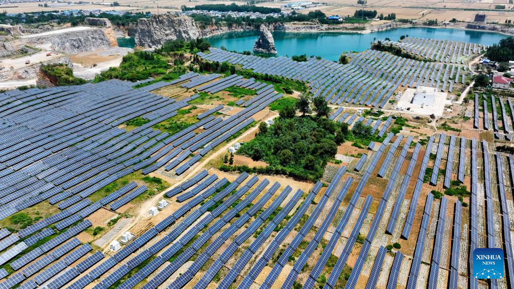 An aerial drone photo shows photovoltaic panels at the Qinglong Mountain resort in Hetaoyuan Town of Juye County, east China's Shandong Province, June 4, 2025.