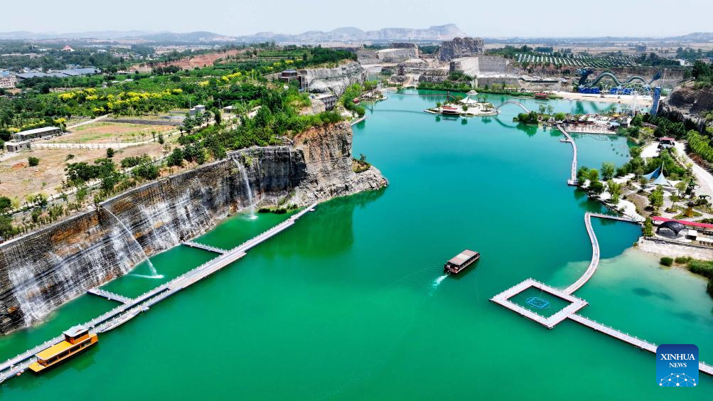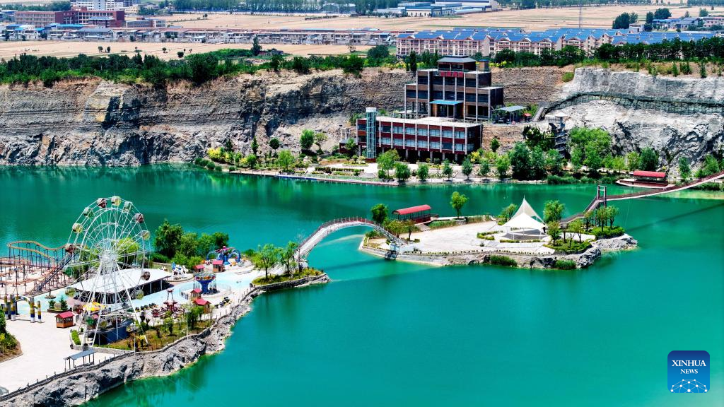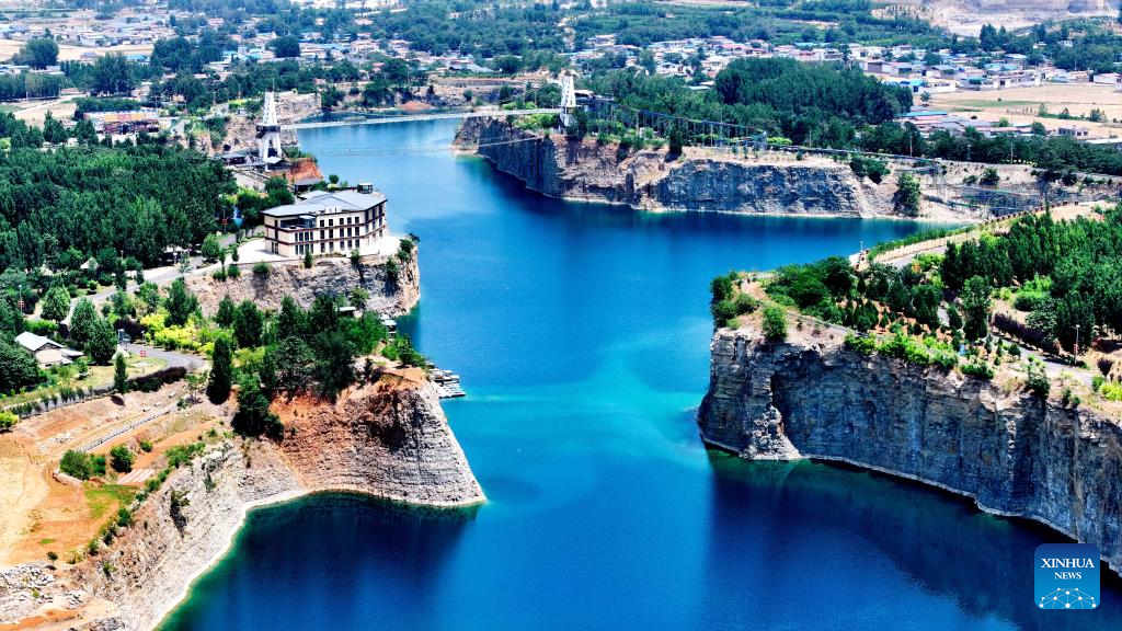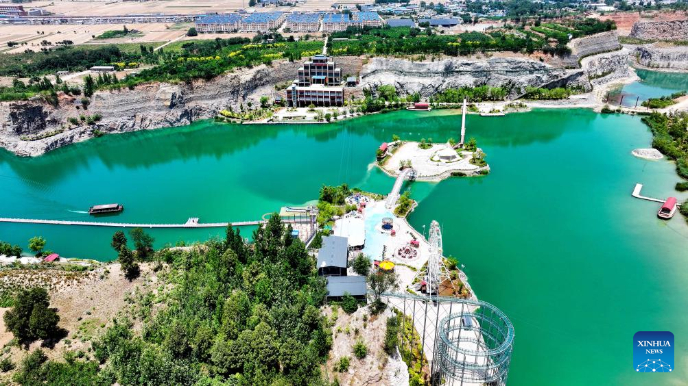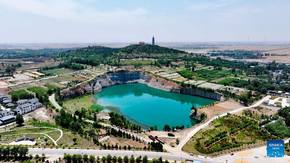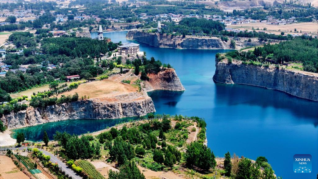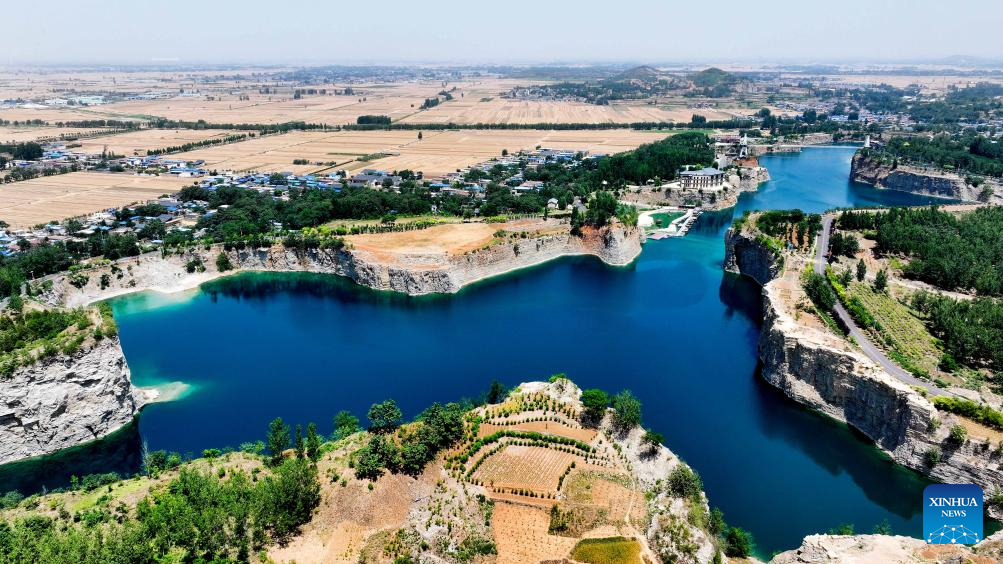 An aerial drone photo shows a view of Tianchi Lake scenic spot at Baihu Mountain in Hetaoyuan Town of Juye County, east China's Shandong Province, June 4, 2025.