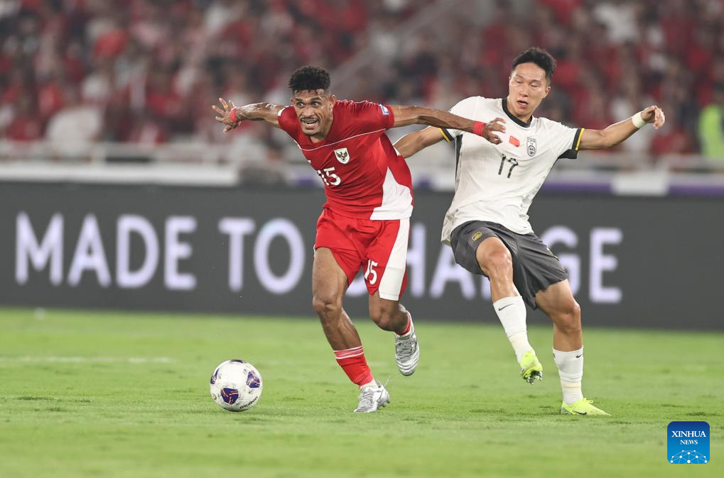 Yang Zexiang (R) of China vies with Ricky Kambuaya of Indonesia during the 2026 FIFA World Cup Asian Qualifiers Group C match between China and Indonesia in Jakarta, Indonesia, June 5, 2025. (Xinhua/Jia Haocheng)