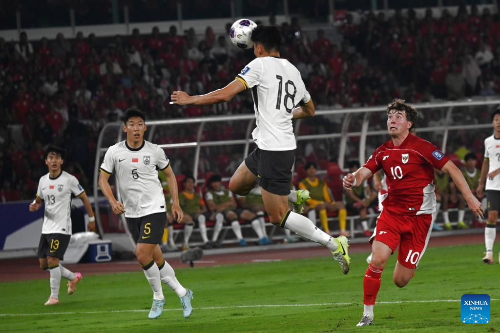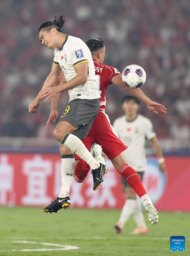 Han Pengfei (Top) of China heads the ball during the 2026 FIFA World Cup Asian Qualifiers Group C match between China and Indonesia in Jakarta, Indonesia, June 5, 2025. (Xinhua/Agung Kuncahya B.)