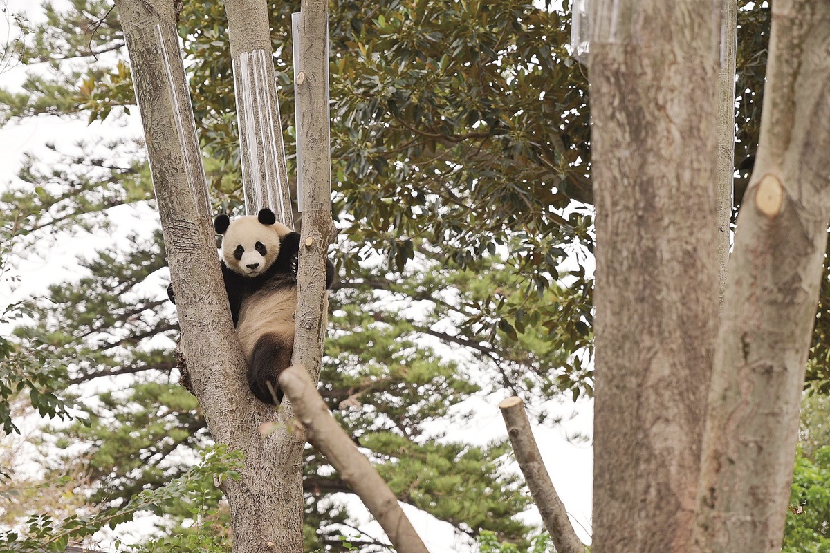 Yi Lan climbs a tree at Adelaide Zoo, South Australia, on May 16. The female giant panda is known for her playful nature. (Xin Xin/China Daily)