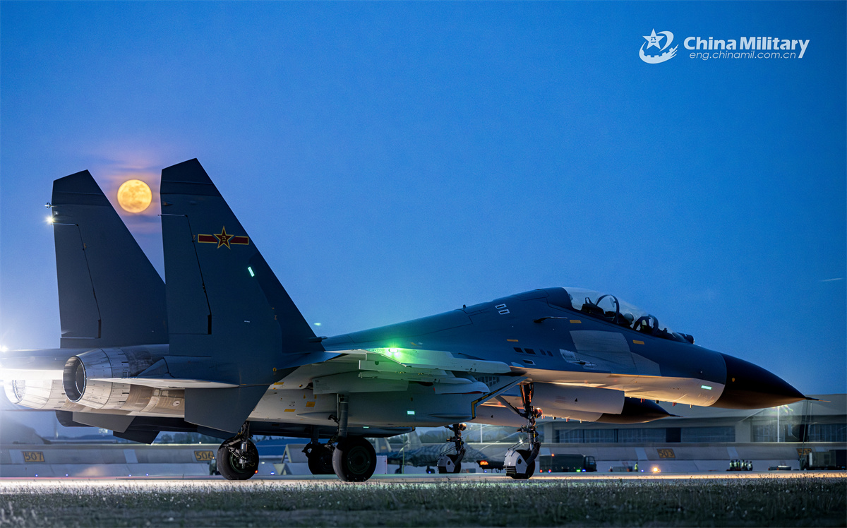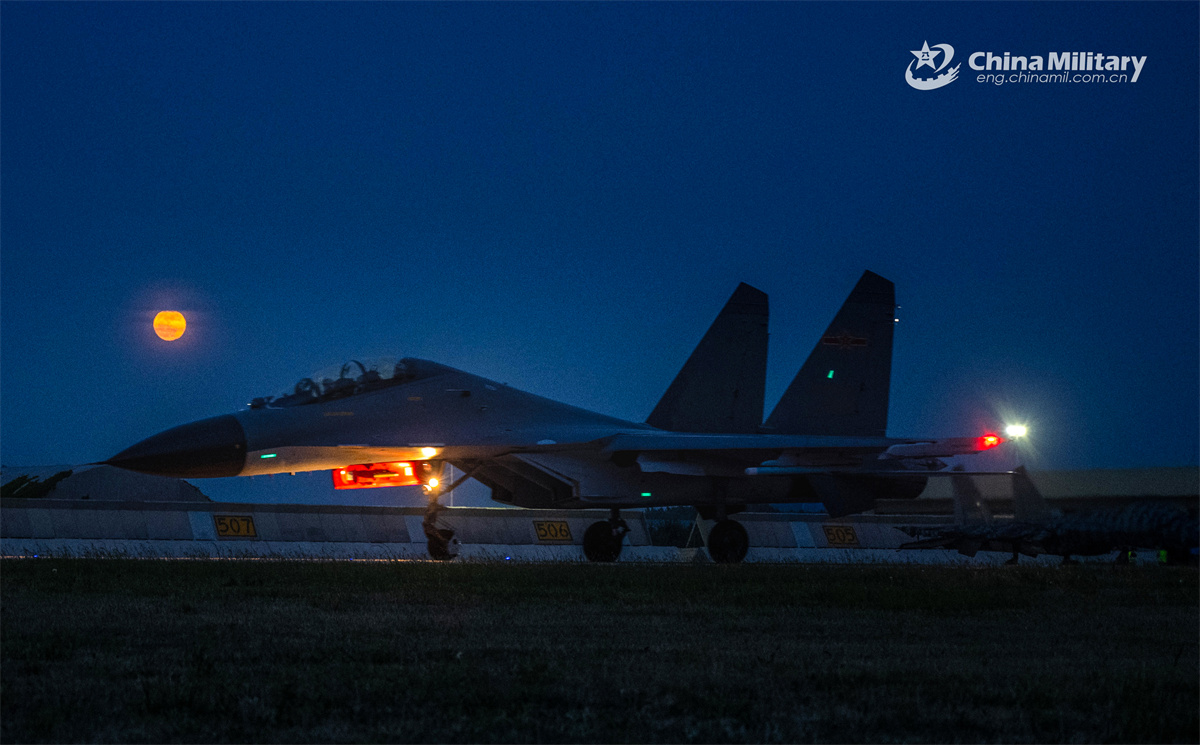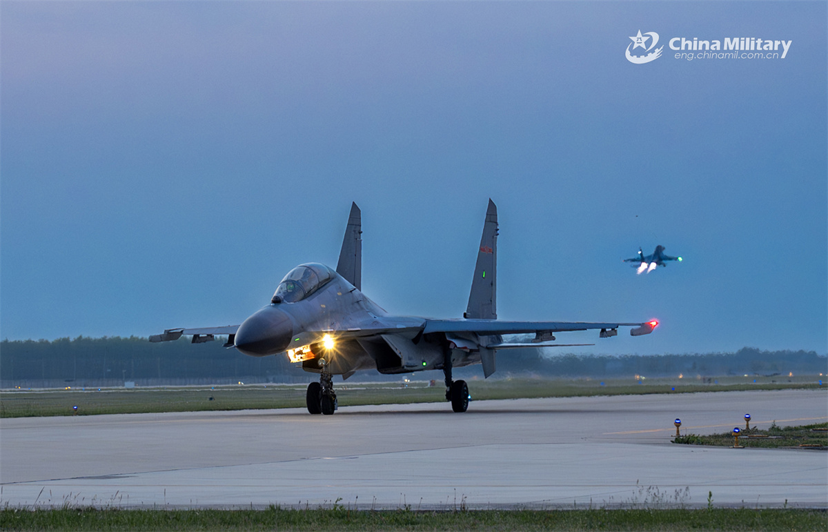 A J-11BS fighter jet attached to an aviation regiment under the Chinese PLA Air Force taxis on the runway during a day-and-night flight training exercise on May 12, 2025. (eng.chinamil.com.cn/Photo by He Wanli)
