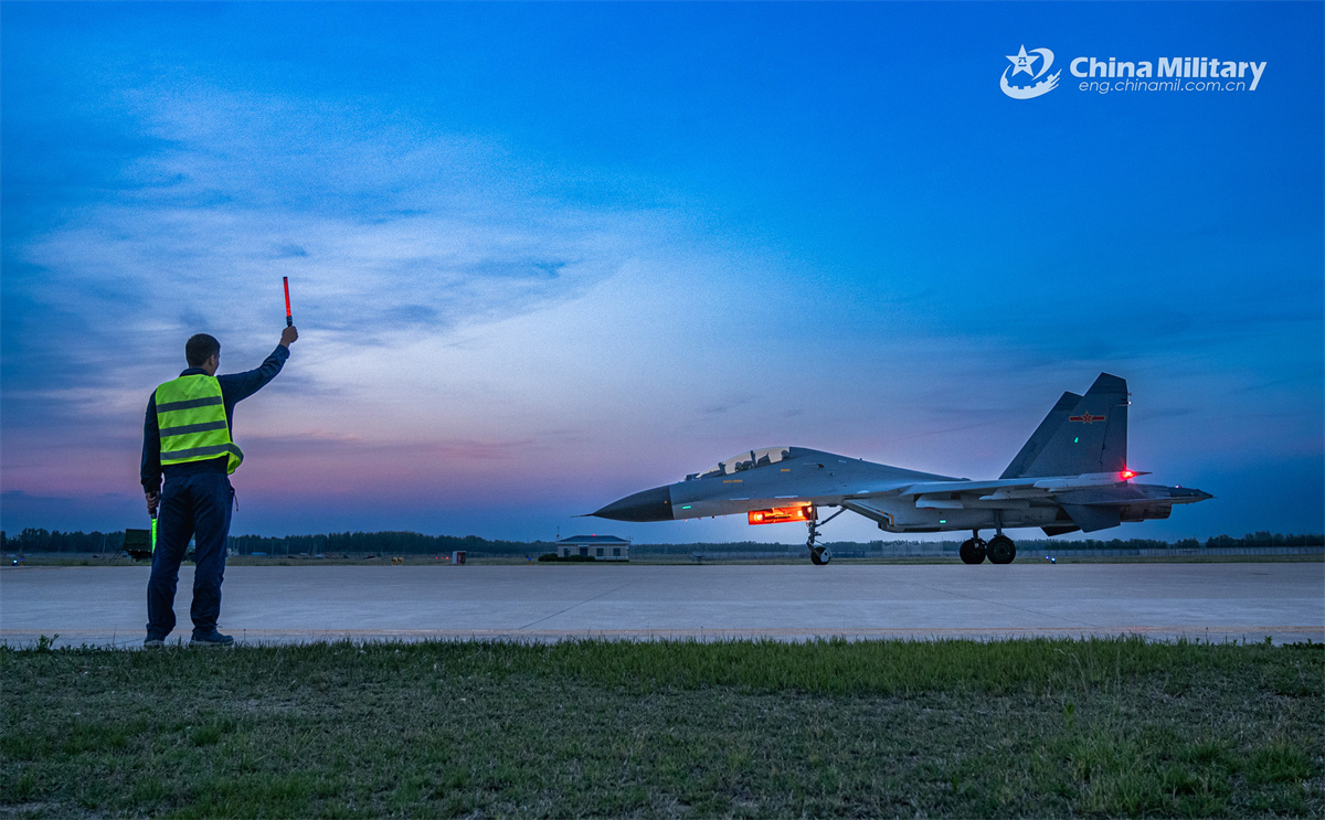 A maintenance member assigned to an aviation regiment under the Chinese PLA Air Force signals a J-11BS fighter jet to take off during a day-and-night flight training exercise on May 12, 2025. (eng.chinamil.com.cn/Photo by He Wanli)