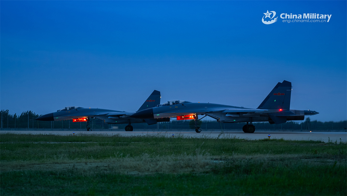 J-11BS fighter jets attached to an aviation regiment under the Chinese PLA Air Force taxi on the runway during a day-and-night flight training exercise on May 12, 2025. (eng.chinamil.com.cn/Photo by He Wanli)