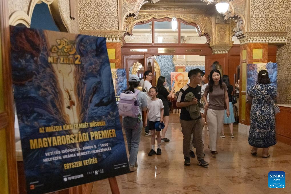 People attend the premiere of Chinese animated blockbuster "Ne Zha 2" in Budapest, Hungary on June 5, 2025. (Photo by Attila Volgyi/Xinhua)