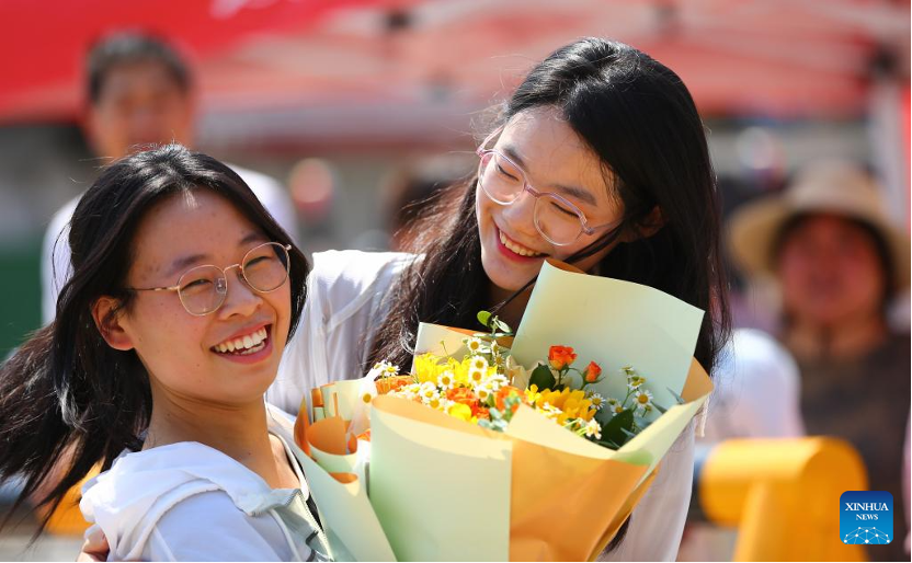 An examinee (L) is presented with flowers by her friend at an exam site in Tengzhou City, east China's Shandong Province, June 10, 2023. (Photo by Li Zhijun/Xinhua)