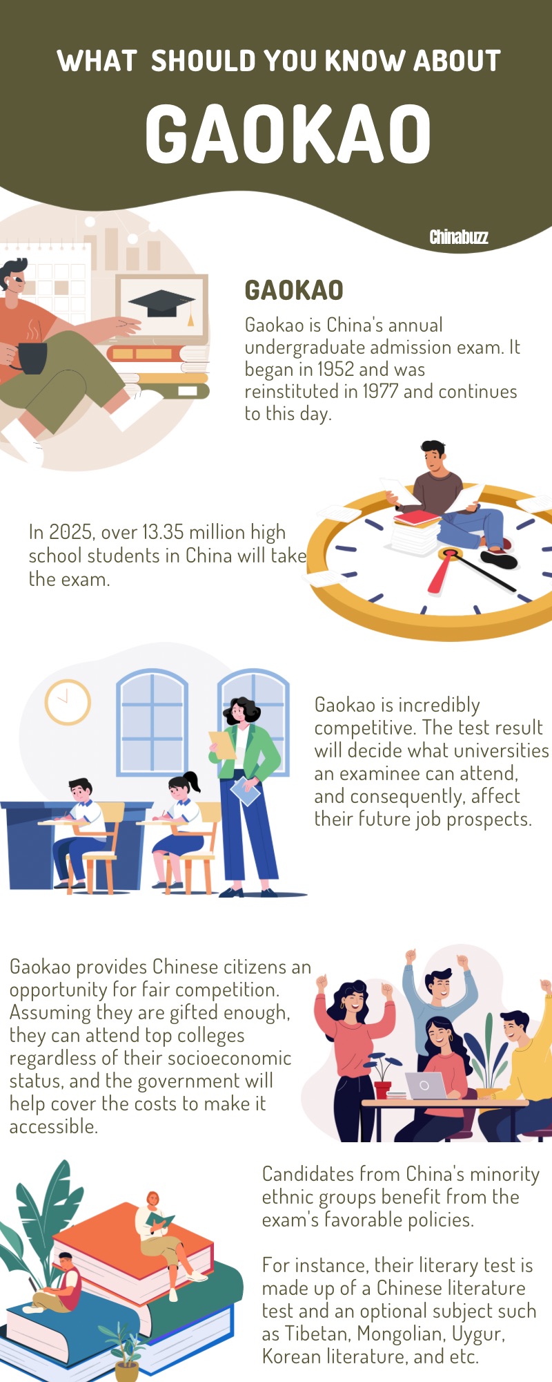 Candidates from China's minority ethnic groups benefit from the exam's favorable policies. For instance, their literary test is made up of a Chinese literature test and an optional subject such as Tibetan, Mongolian, Uygur, Korean literature, and etc.
