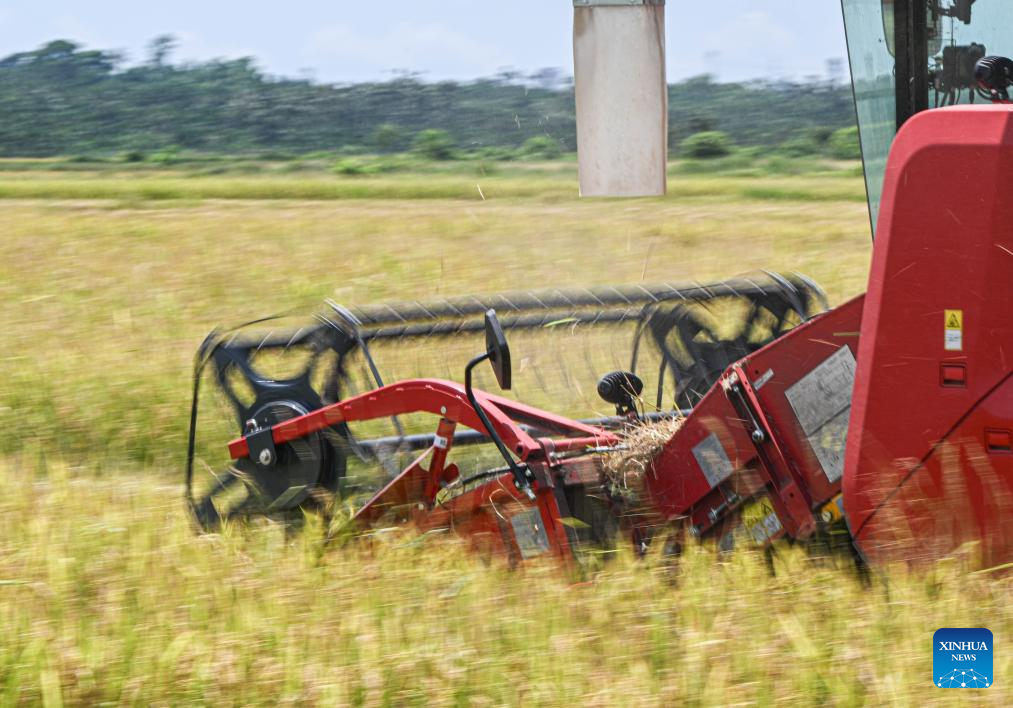 A harvester reaps rice in a field in Moqiao Village of Qiongshan District of Haikou City, south China's Hainan Province, June 7, 2025. The rice harvest season has arrived in Moqiao, where farmers are seizing the good weather to accelerate harvesting.