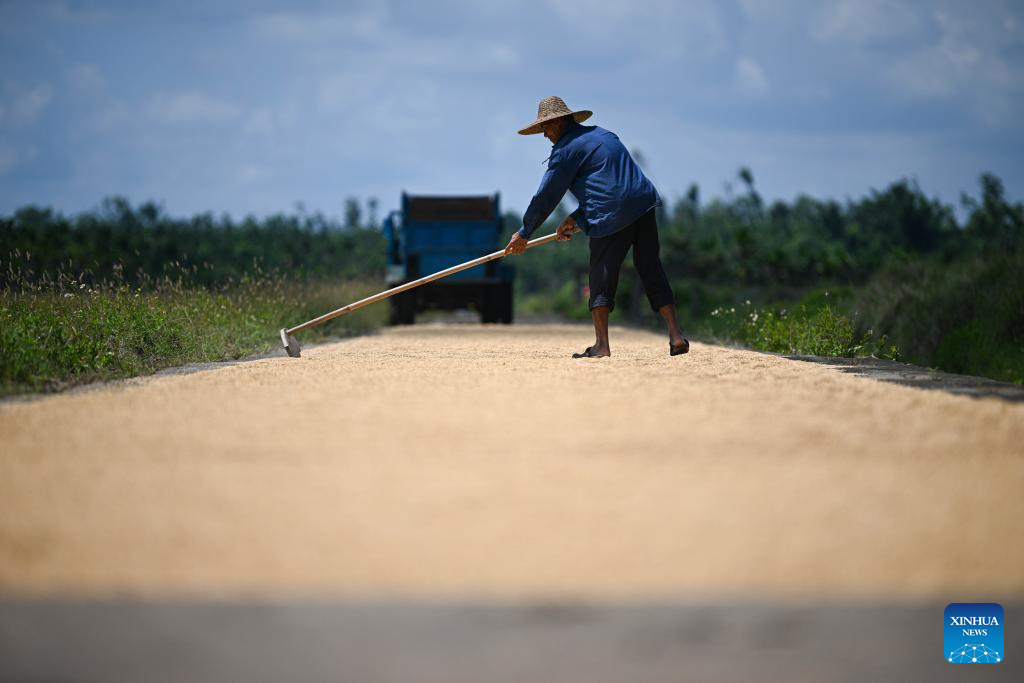 A farmer dries harvested rice in Moqiao Village of Qiongshan District of Haikou City, south China's Hainan Province, June 7, 2025. The rice harvest season has arrived in Moqiao, where farmers are seizing the good weather to accelerate harvesting.