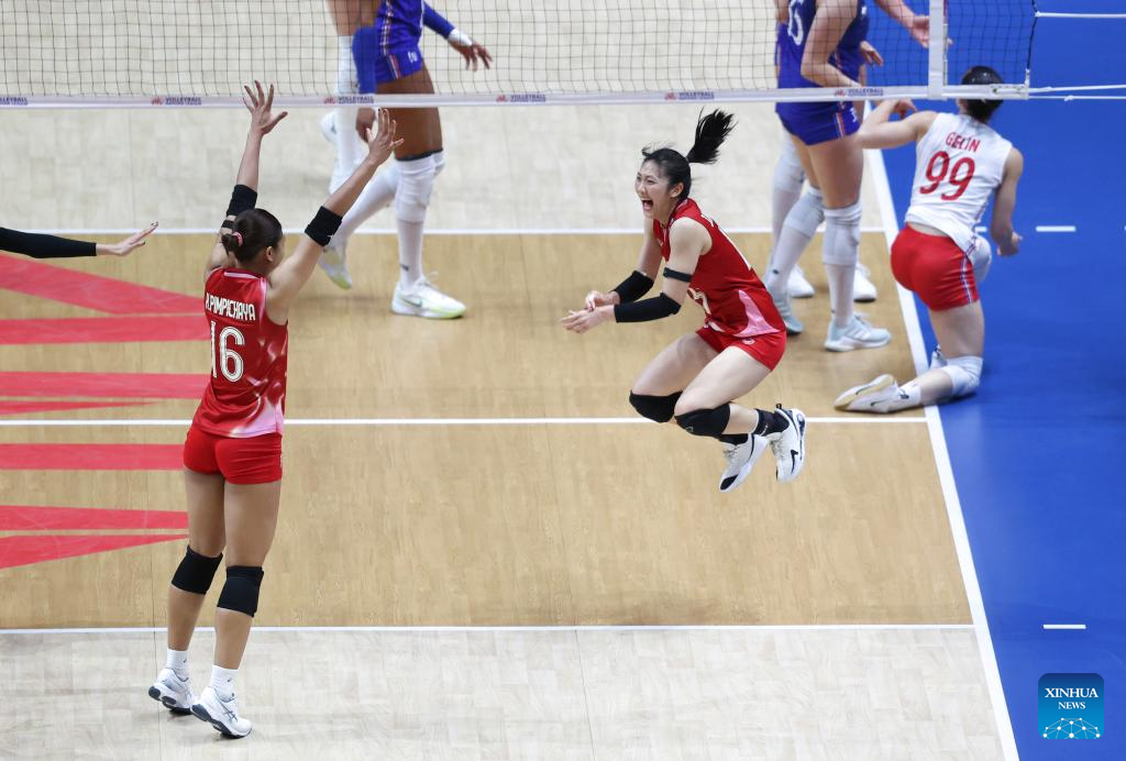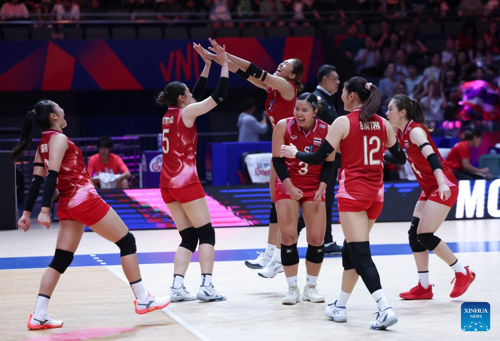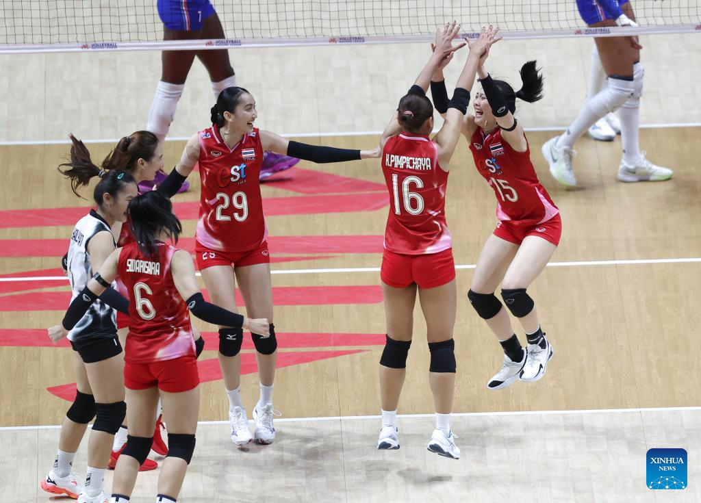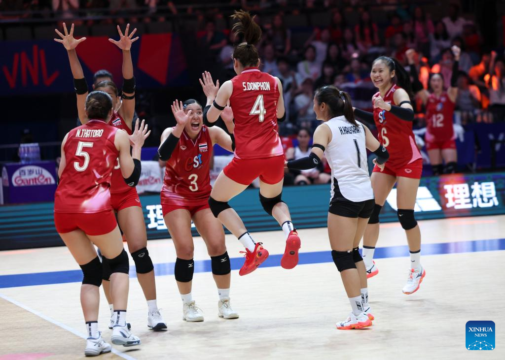 Players of Thailand celebrate scoring during the Pool 3 match between France and Thailand at the Women's Volleyball Nations League (VNL) 2025 at the National Indoor Stadium in Beijing, China, June 8, 2025. (Xinhua/Luo Yuan)