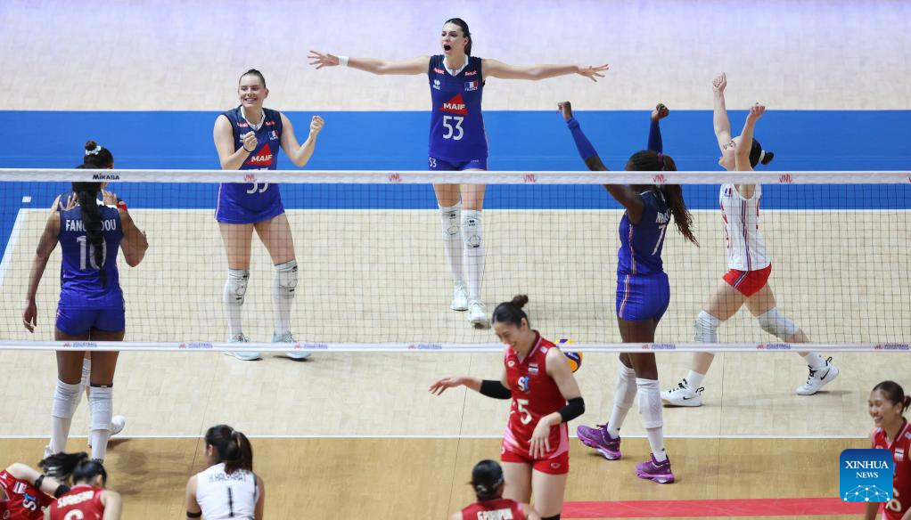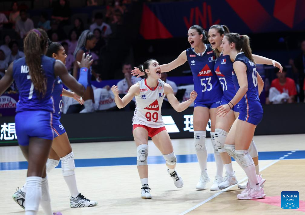 Players of France celebrate scoring during the Pool 3 match between France and Thailand at the Women's Volleyball Nations League (VNL) 2025 at the National Indoor Stadium in Beijing, China, June 8, 2025. (Xinhua/Luo Yuan)