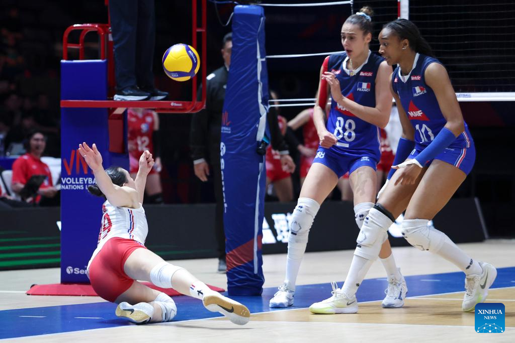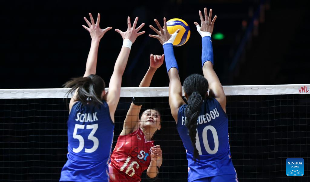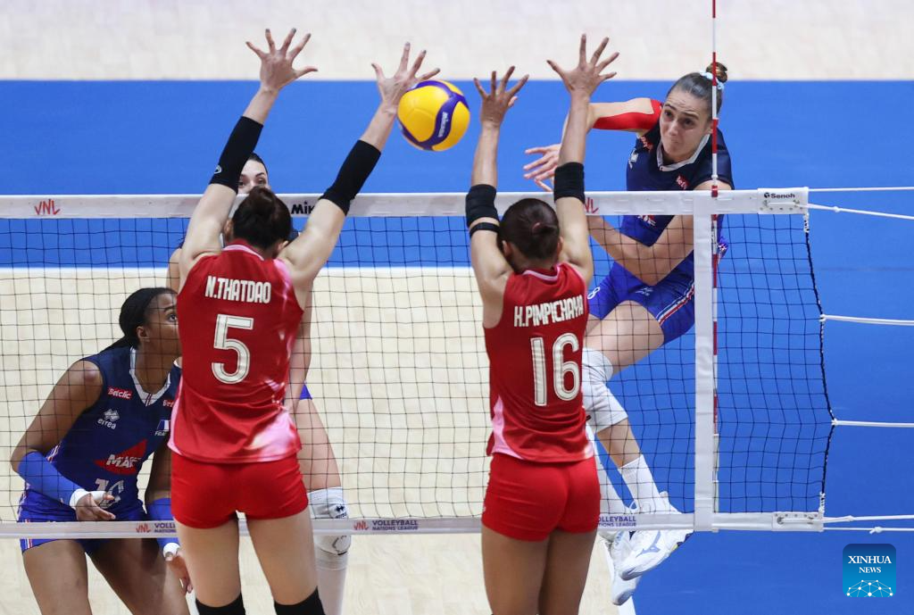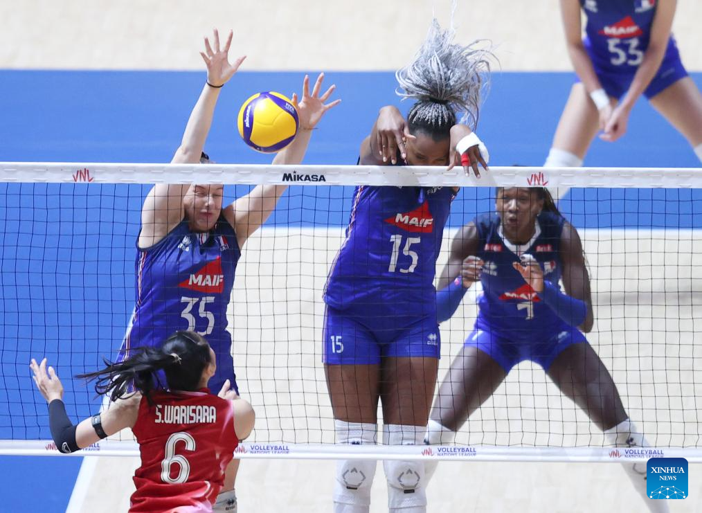 France's Amelie Rotar (1st R) spikes the ball during the Pool 3 match between France and Thailand at the Women's Volleyball Nations League (VNL) 2025 at the National Indoor Stadium in Beijing, China, June 8, 2025. (Xinhua/Luo Yuan)