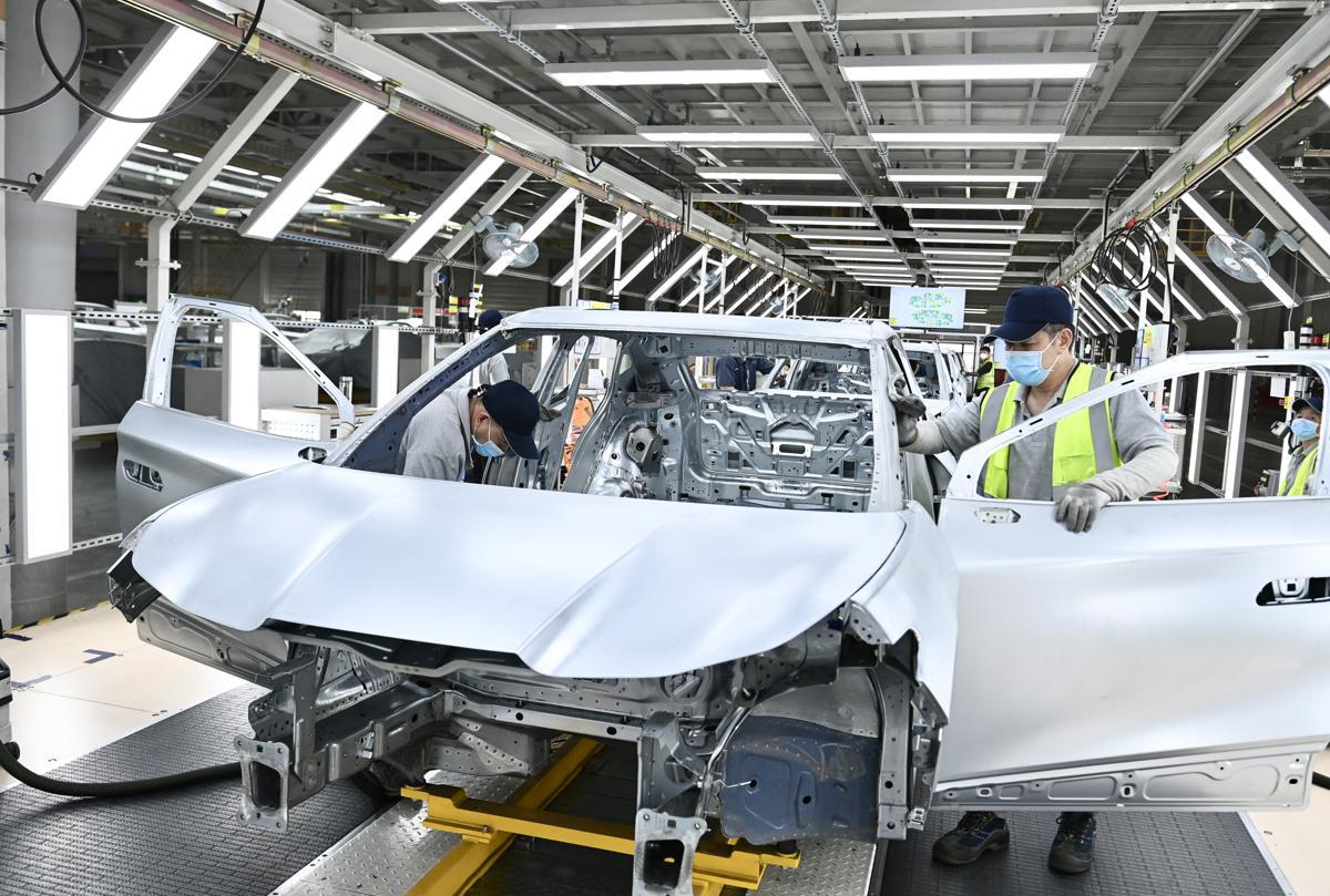 Workers assemble a car at the FAW-Volkswagen production base in Qingdao, Shandong province, on April 15. (Liang Xiaopeng/Xinhua)