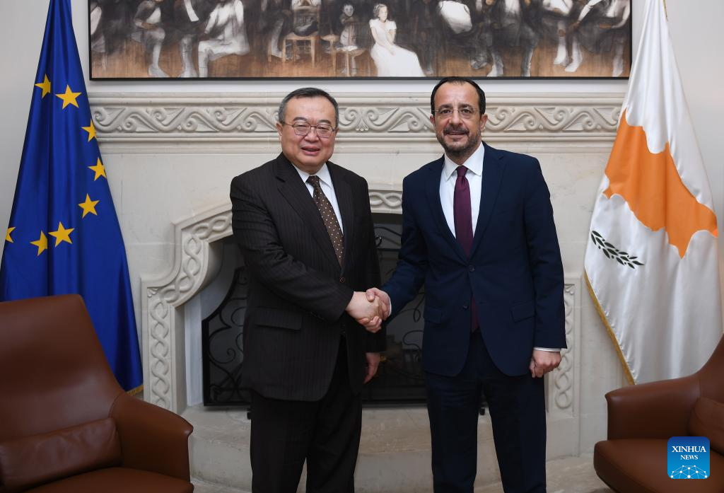 Liu Jianchao, head of the International Department of the Communist Party of China (CPC) Central Committee, meets with Cypriot President Nikos Christodoulides in Nicosia, Cyprus, June 6, 2025. A delegation of the CPC led by Liu Jianchao concluded a three-day visit to Cyprus Saturday. During the visit, Liu met and held discussions with Cypriot President Nikos Christodoulides; Annita Demetriou, president of the House of Representatives and president of the Democratic Rally Party, Democratic Party leader Nikolas Papadopoulos, General Secretary of the Progressive Party of Working People (AKEL)Stefanos Stefanou, and Acting Permanent Secretary of the Ministry of Foreign Affairs Theodora Constantinidou. The CPC delegation also visited a grassroots organization of AKEL in the Paphos District and Liu delivered a keynote speech to representatives from various sectors of Cypriot society, in which he expounded on China's policy toward Europe. (Xinhua/He Canling)