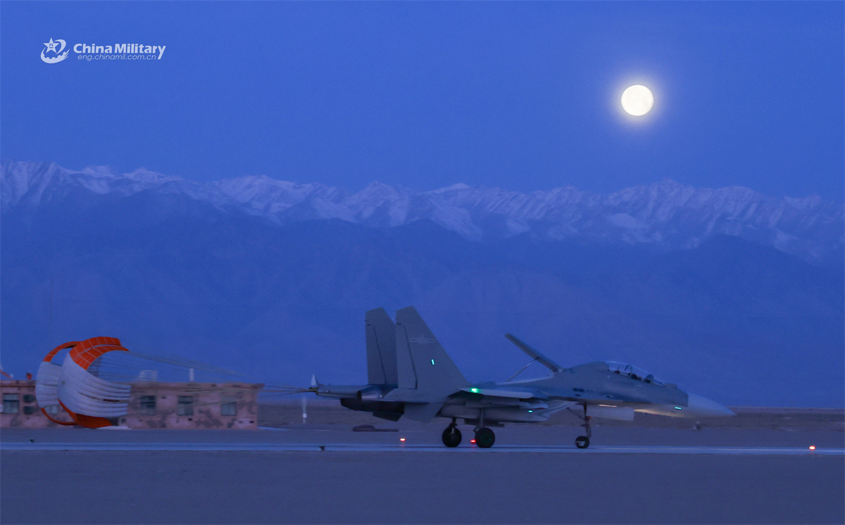 A J-16 multi-role fighter jet attached to a unit under the Chinese PLA Air Force releases drag chute to slow down while landing on the runway during a nighttime flight training exercise on May 23, 2025. (eng.chinamil.com.cn/Photo by Liu Dezheng and Wang Lu)
