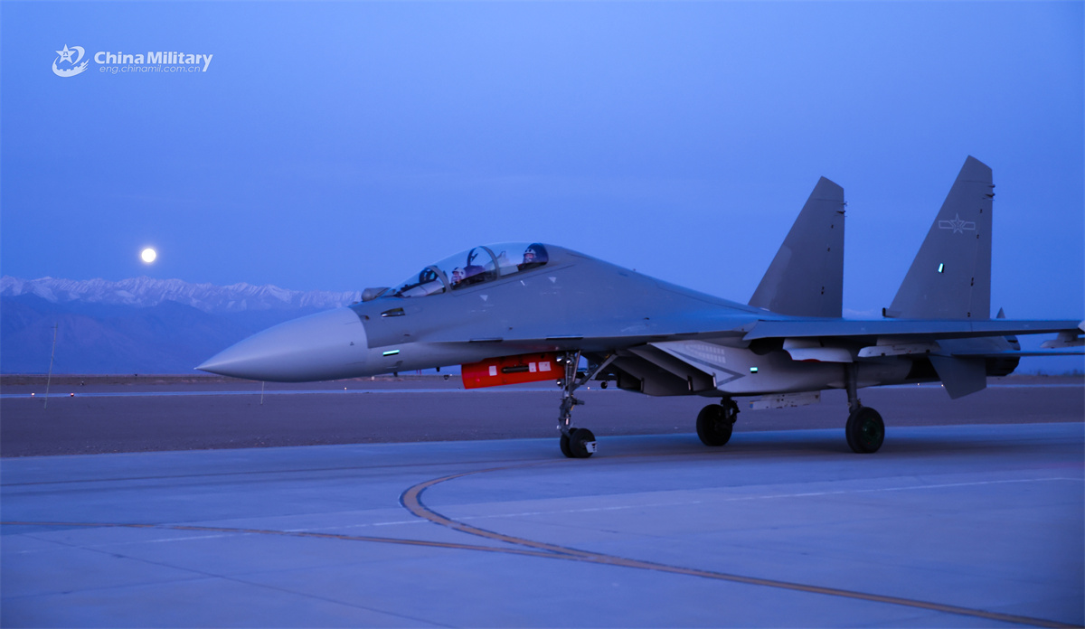 A J-16 multi-role fighter jet attached to a unit under the Chinese PLA Air Force taxis on the runway during a nighttime flight training exercise on May 23, 2025. (eng.chinamil.com.cn/Photo by Liu Dezheng and Wang Lu)