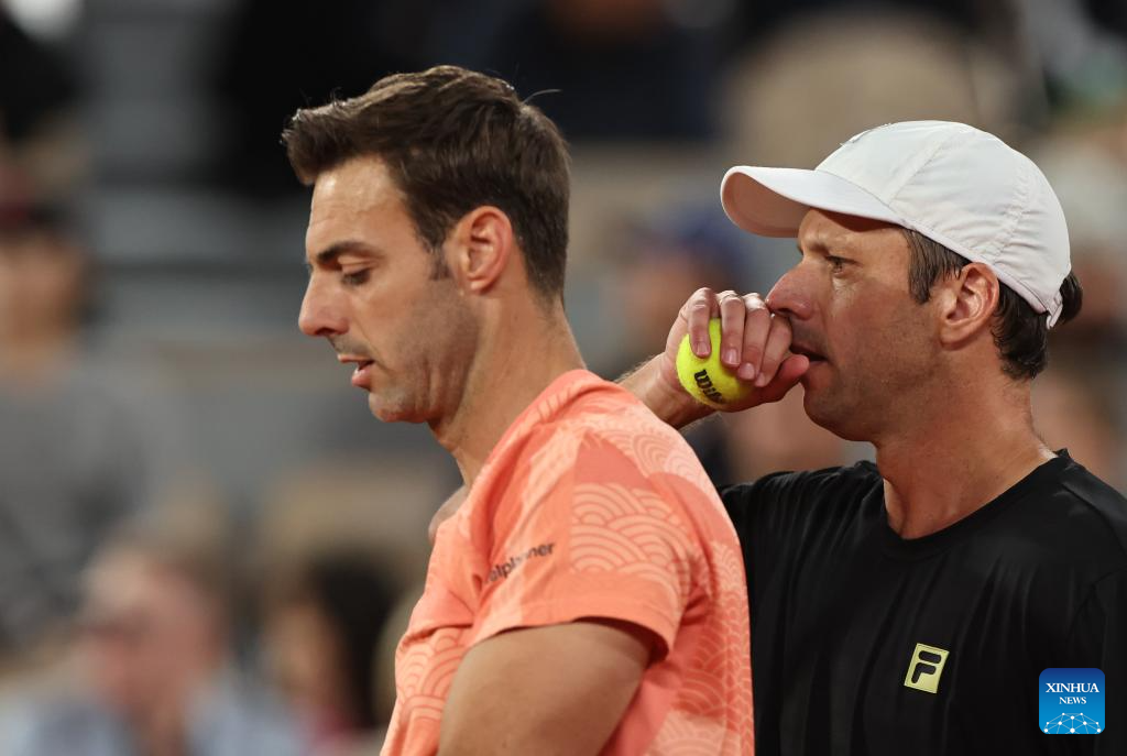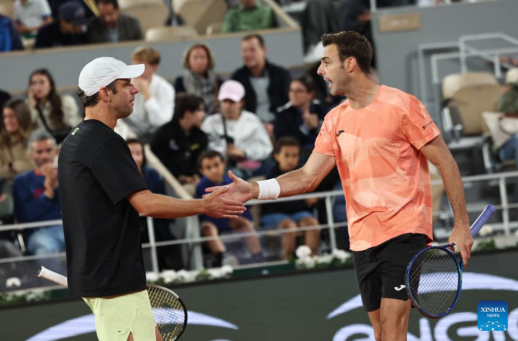 Marcel Granollers (L)/Horacio Zeballos react during the men's doubles final match between Marcel Granollers of Spain/Horacio Zeballos of Argentina and Joe Salisbury/Neal Skupski of Britain at the French Open tennis tournament at Roland Garros, Paris, France, June 7, 2025. (Xinhua/Li Jing)