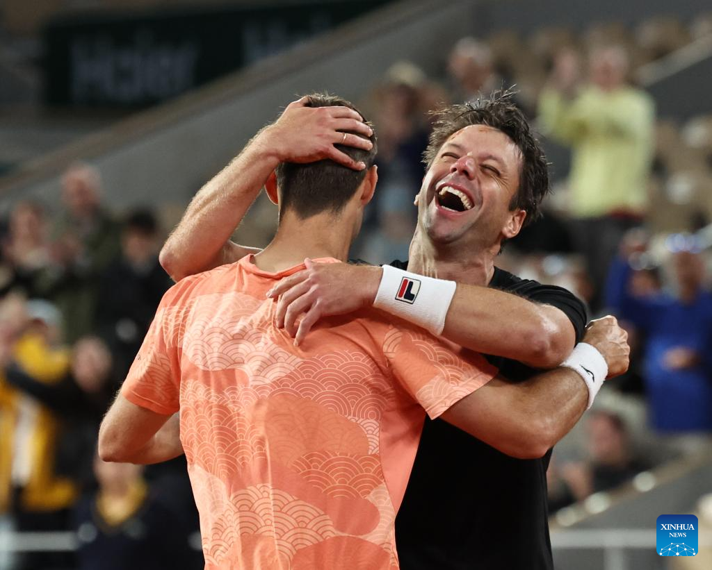 Marcel Granollers/Horacio Zeballos (R) celebrate after winning the men's doubles final match between Marcel Granollers of Spain/Horacio Zeballos of Argentina and Joe Salisbury/Neal Skupski of Britain at the French Open tennis tournament at Roland Garros, Paris, France, June 7, 2025. (Xinhua/Li Jing)