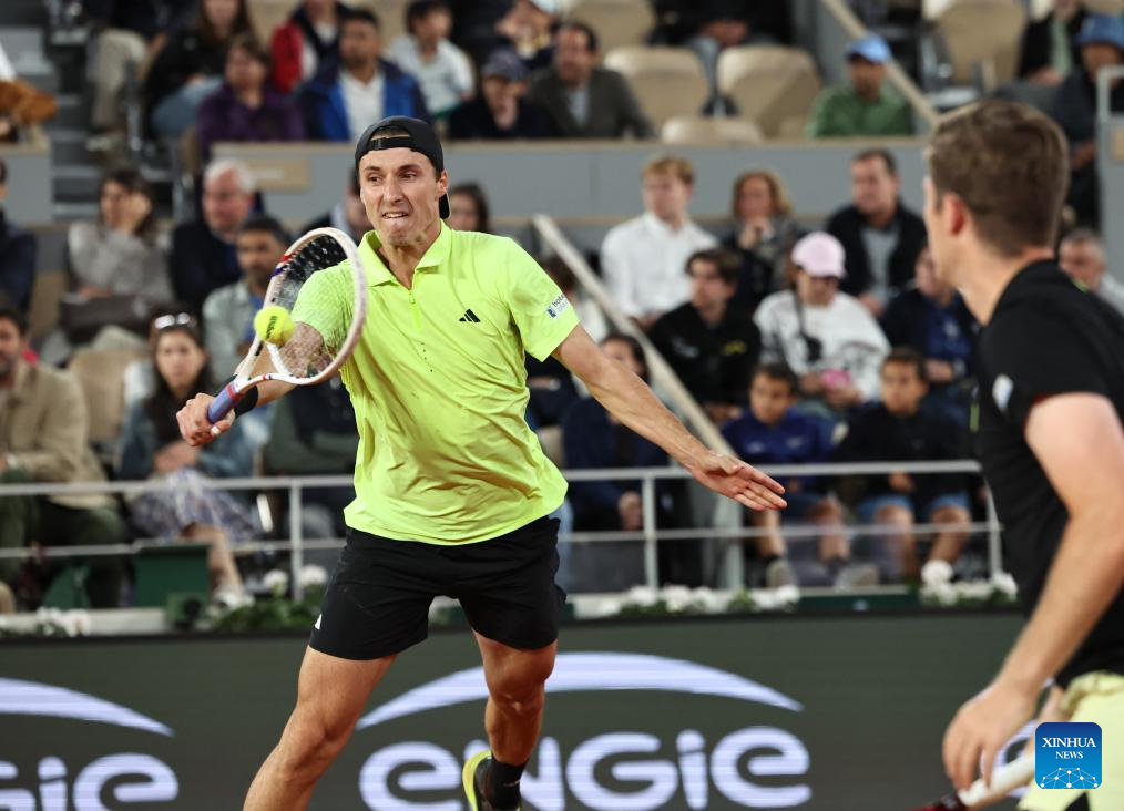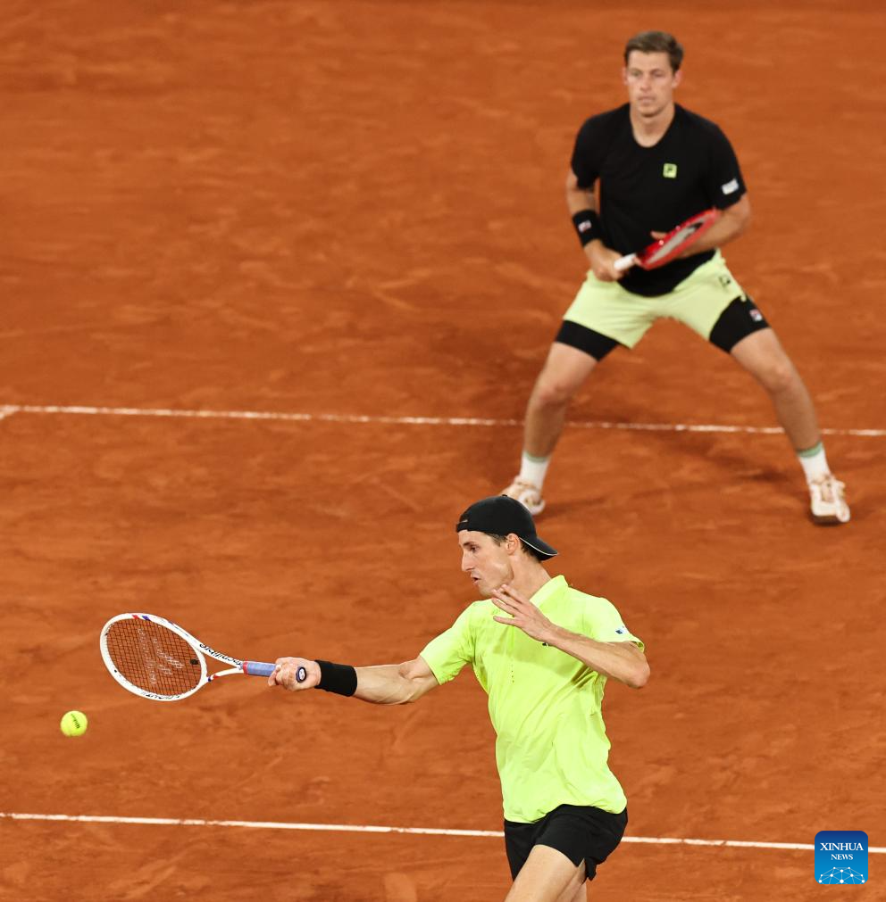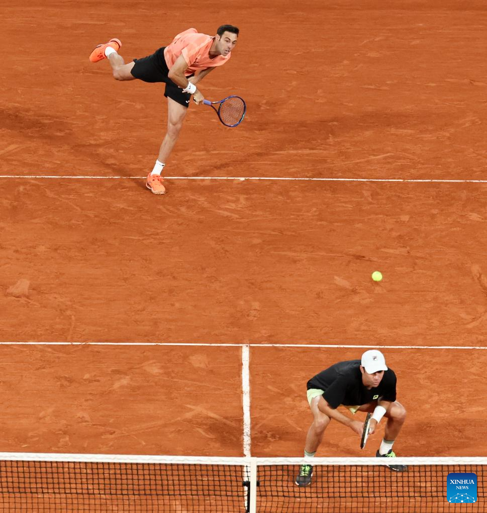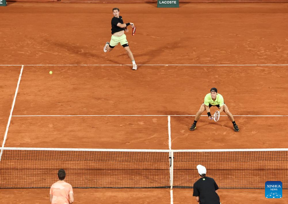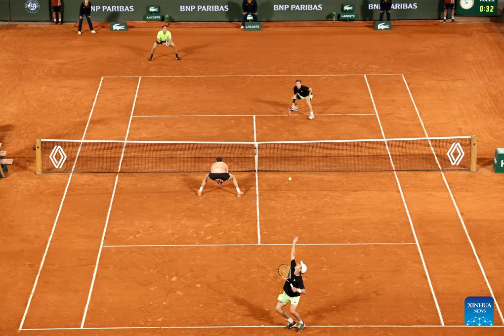 Joe Salisbury (top R)/Neal Skupski (top L) compete during the men's doubles final match between Marcel Granollers of Spain/Horacio Zeballos of Argentina and Joe Salisbury/Neal Skupski of Britain at the French Open tennis tournament at Roland Garros, Paris, France, June 7, 2025. (Xinhua/Li Jing)
