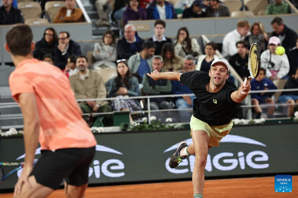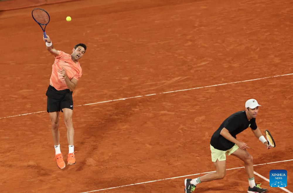 Marcel Granollers/Horacio Zeballos (R) compete during the men's doubles final match between Marcel Granollers of Spain/Horacio Zeballos of Argentina and Joe Salisbury/Neal Skupski of Britain at the French Open tennis tournament at Roland Garros, Paris, France, June 7, 2025. (Xinhua/Li Jing)