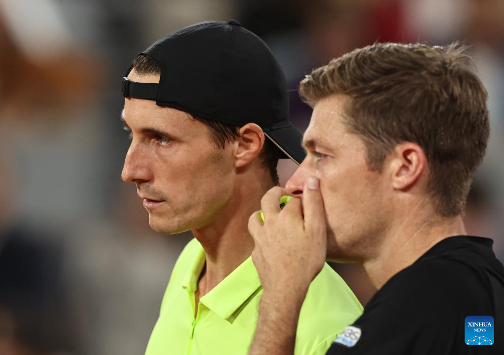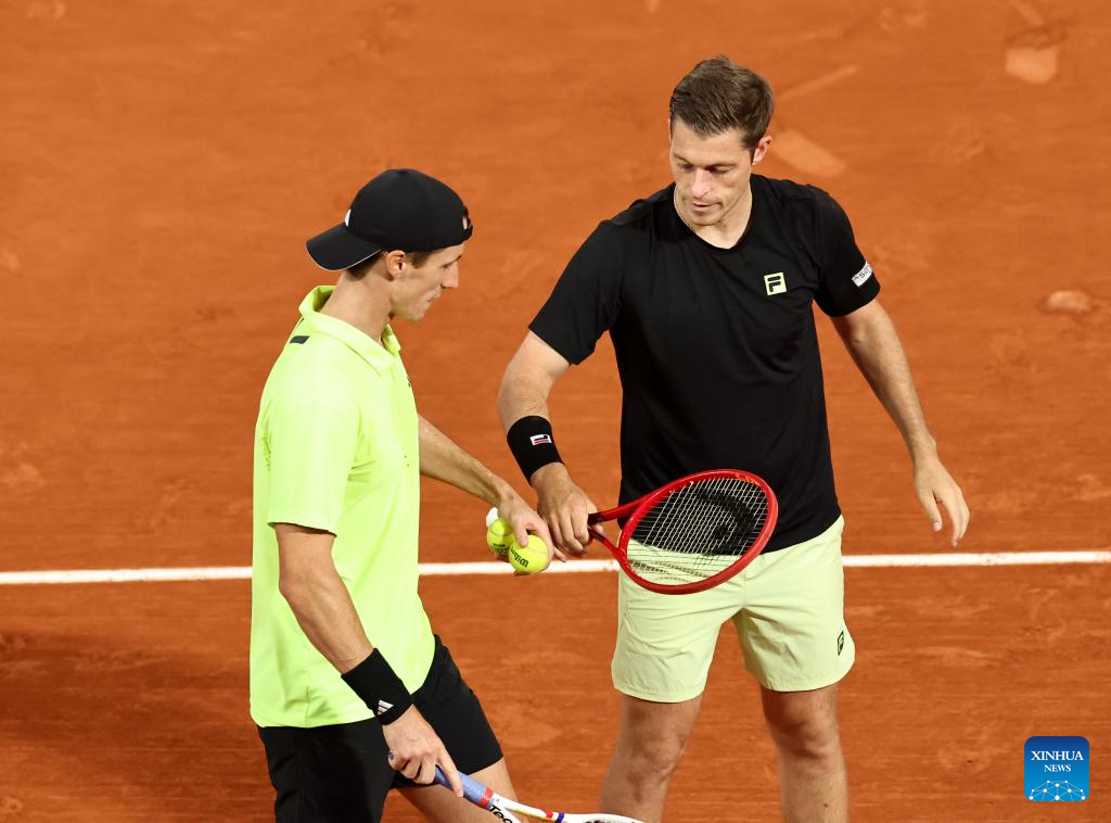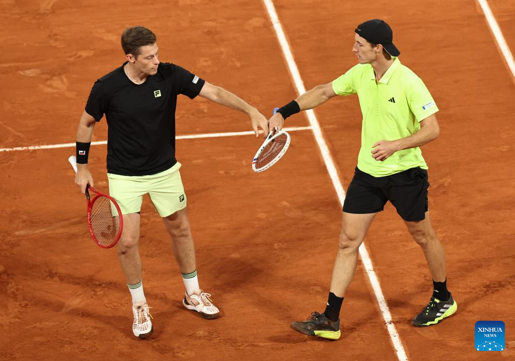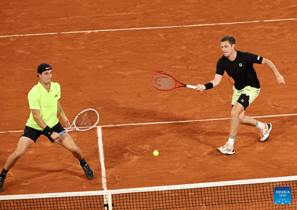 Joe Salisbury (front)/Neal Skupski compete during the men's doubles final match between Marcel Granollers of Spain/Horacio Zeballos of Argentina and Joe Salisbury/Neal Skupski of Britain at the French Open tennis tournament at Roland Garros, Paris, France, June 7, 2025. (Xinhua/Li Jing)