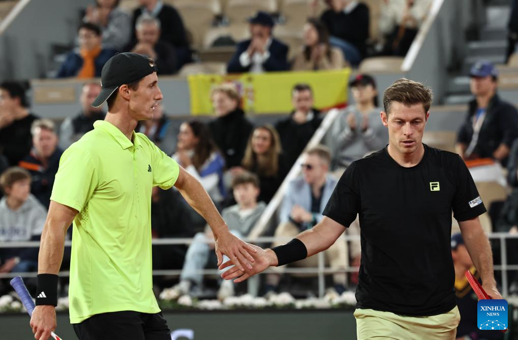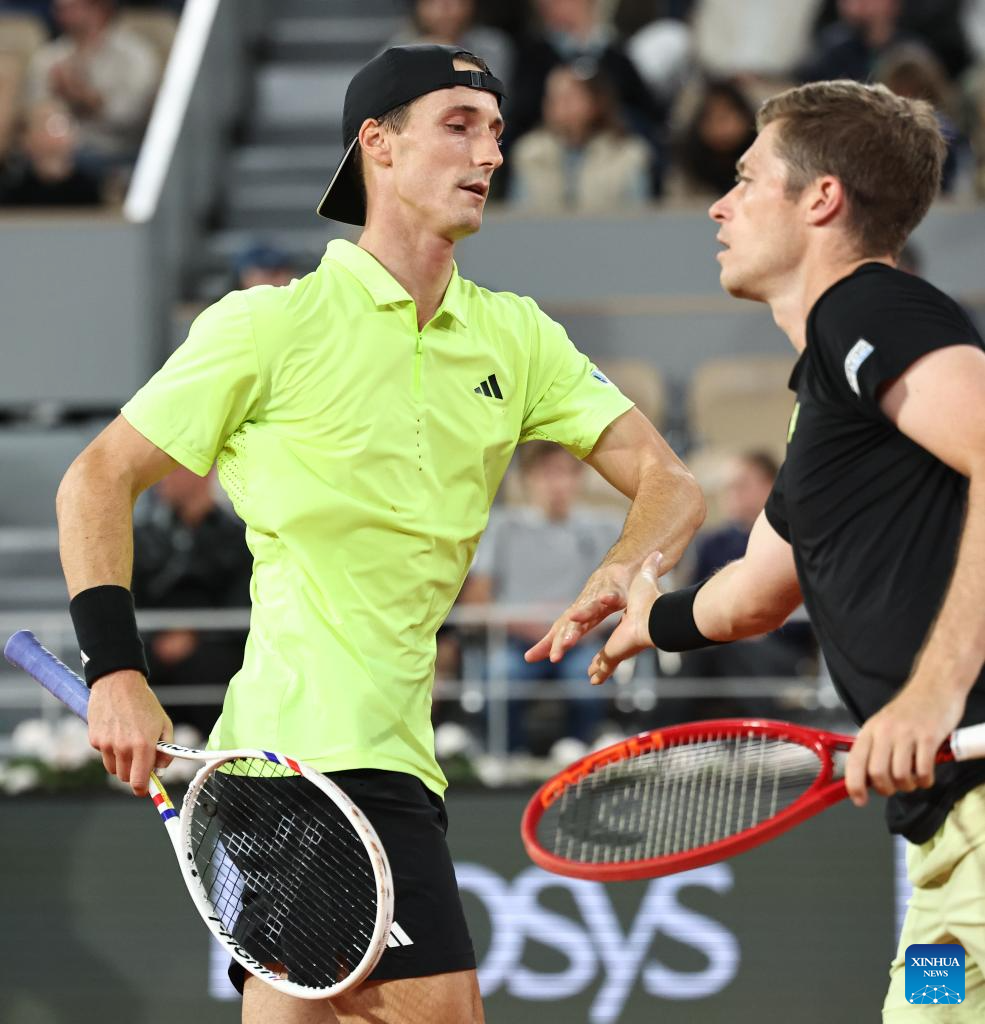 Joe Salisbury (L)/Neal Skupski compete during the men's doubles final match between Marcel Granollers of Spain/Horacio Zeballos of Argentina and Joe Salisbury/Neal Skupski of Britain at the French Open tennis tournament at Roland Garros, Paris, France, June 7, 2025. (Xinhua/Li Jing)