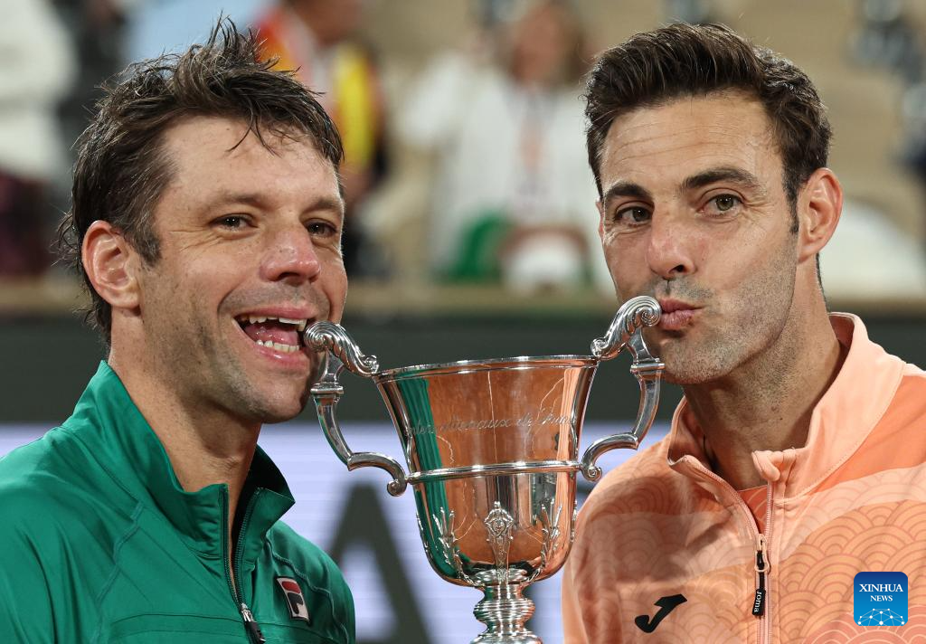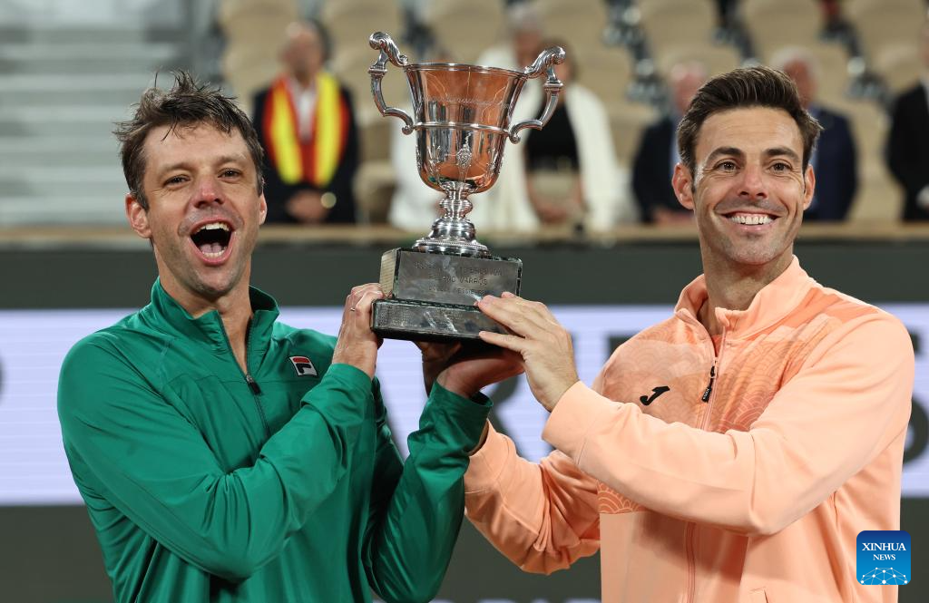 Winners Marcel Granollers (R)/Horacio Zeballos celebrate with the trophy during the awarding ceremony after the men's doubles final match between Marcel Granollers of Spain/Horacio Zeballos of Argentina and Joe Salisbury/Neal Skupski of Britain at the French Open tennis tournament at Roland Garros, Paris, France, June 7, 2025. (Xinhua/Li Jing)