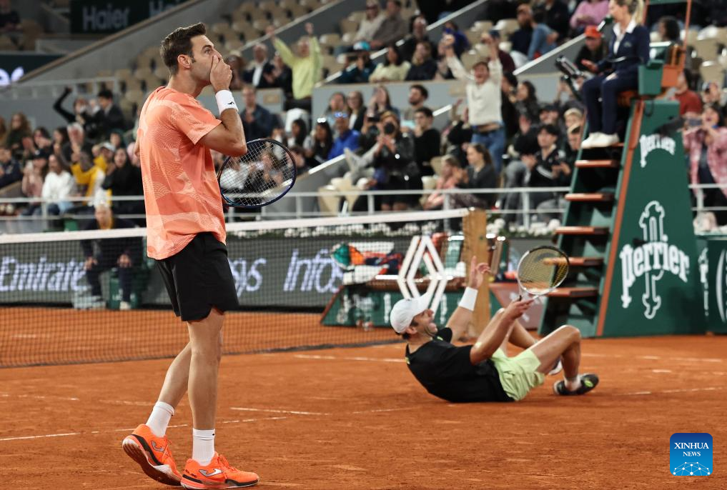 Winners Marcel Granollers (R)/Horacio Zeballos celebrate scoring during the men's doubles final match between Marcel Granollers of Spain/Horacio Zeballos of Argentina and Joe Salisbury/Neal Skupski of Britain at the French Open tennis tournament at Roland Garros, Paris, France, June 7, 2025. (Xinhua/Li Jing)