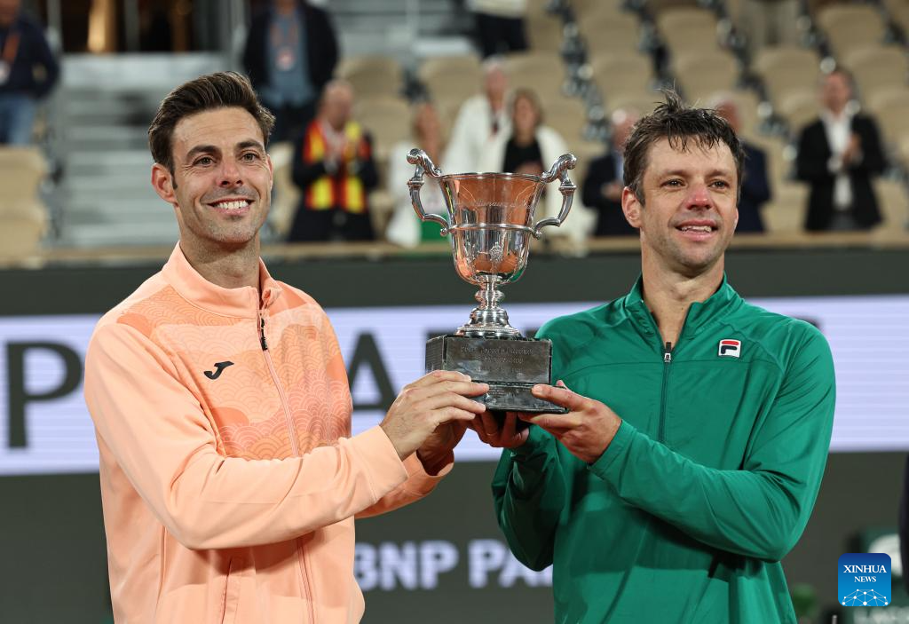 Winners Marcel Granollers (R)/Horacio Zeballos pose with the trophy during the awarding ceremony after the men's doubles final match between Marcel Granollers of Spain/Horacio Zeballos of Argentina and Joe Salisbury/Neal Skupski of Britain at the French Open tennis tournament at Roland Garros, Paris, France, June 7, 2025. (Xinhua/Li Jing)