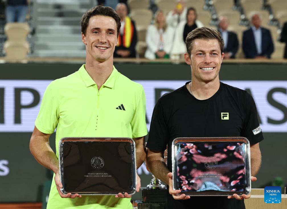 Runners-up Joe Salisbury (L)/Neal Skupski pose with their trophies during the awarding ceremony after the men's doubles final match between Marcel Granollers of Spain/Horacio Zeballos of Argentina and Joe Salisbury/Neal Skupski of Britain at the French Open tennis tournament at Roland Garros, Paris, France, June 7, 2025. (Xinhua/Li Jing)
