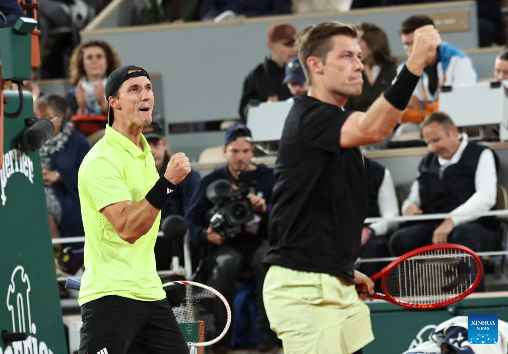 Joe Salisbury (L)/Neal Skupski celebrate during the men's doubles final match between Marcel Granollers of Spain/Horacio Zeballos of Argentina and Joe Salisbury/Neal Skupski of Britain at the French Open tennis tournament at Roland Garros, Paris, France, June 7, 2025. (Xinhua/Li Jing)