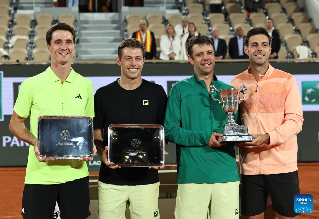 Winners Marcel Granollers (1st R)/Horacio Zeballos (2nd R) pose with runners-up Joe Salisbury(1st L)/Neal Skupski during the awarding ceremony after the men's doubles final match between Marcel Granollers of Spain/Horacio Zeballos of Argentina and Joe Salisbury/Neal Skupski of Britain at the French Open tennis tournament at Roland Garros, Paris, France, June 7, 2025. (Xinhua/Li Jing)