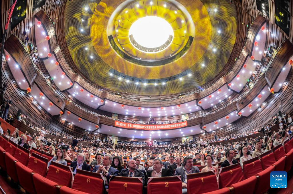 This photo taken on June 9, 2025 shows the opening ceremony of the Fifth China (Ningxia) International Wine Culture and Tourism Expo in Yinchuan, northwest China's Ningxia Hui Autonomous Region. The Fifth China (Ningxia) International Wine Culture and Tourism Expo opened Monday in Yinchuan, capital of northwest China's Ningxia Hui Autonomous Region, with the Concours Mondial de Bruxelles (CMB) -- dubbed the "Wine Olympics" -- returning to China after seven years.