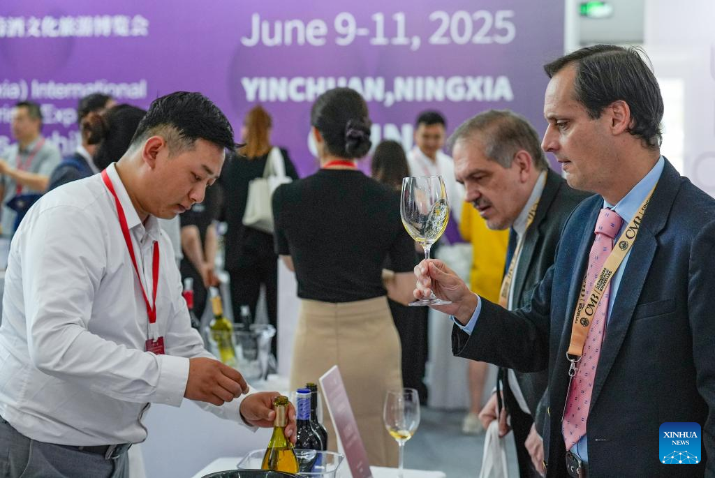 A visitor (1st R) tastes wine at the Global Wineries Exhibition during the Fifth China (Ningxia) International Wine Culture and Tourism Expo in Yinchuan, northwest China's Ningxia Hui Autonomous Region, on June 9, 2025. The Fifth China (Ningxia) International Wine Culture and Tourism Expo opened Monday in Yinchuan, capital of northwest China's Ningxia Hui Autonomous Region, with the Concours Mondial de Bruxelles (CMB) -- dubbed the "Wine Olympics" -- returning to China after seven years.