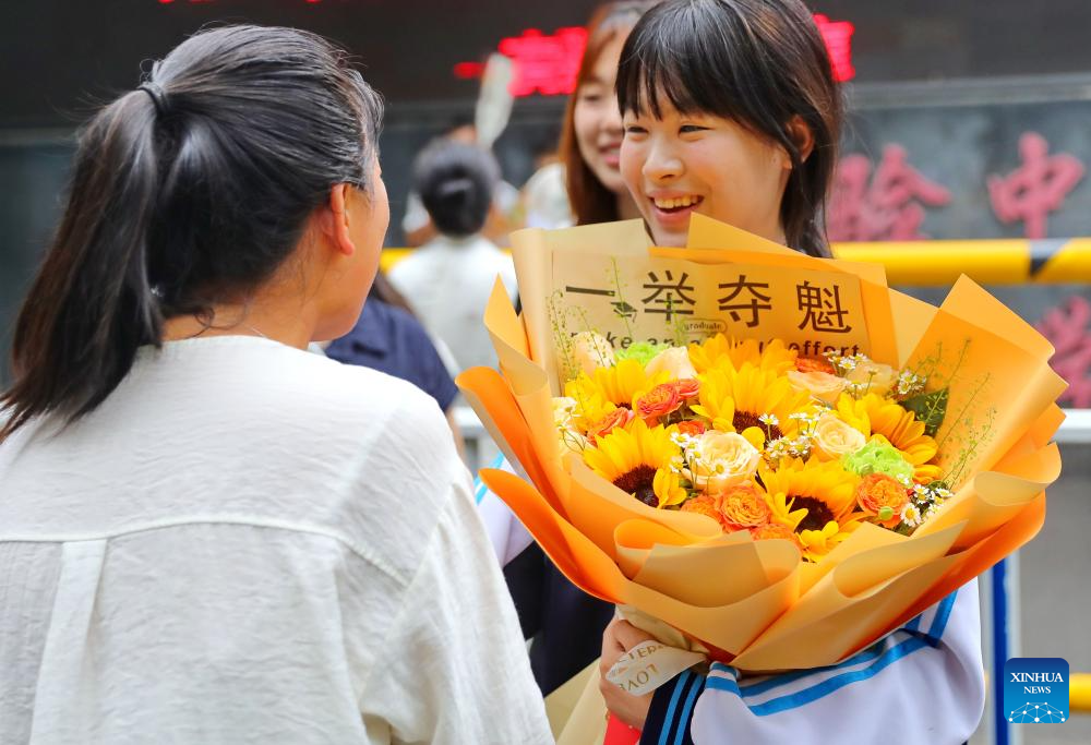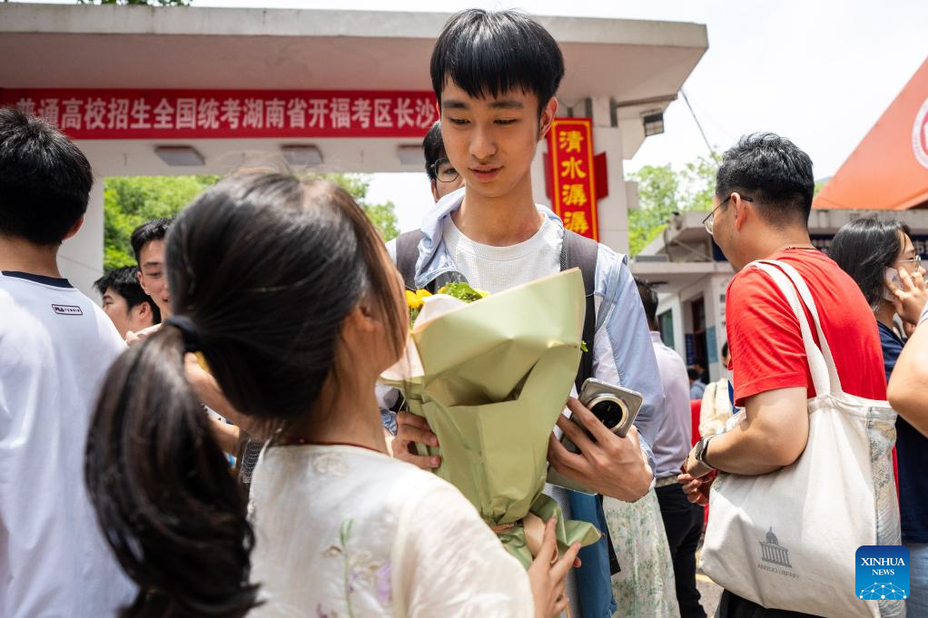 A family member presents flowers to a student after the exam at a national college entrance examination site in Changsha, central China's Hunan Province, June 9, 2025. China's national college entrance exam, also known as the gaokao, began on June 7 this year. The exam in some regions has ended on Monday. (Xinhua/Chen Sihan)
