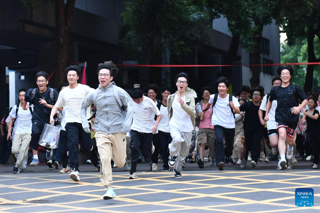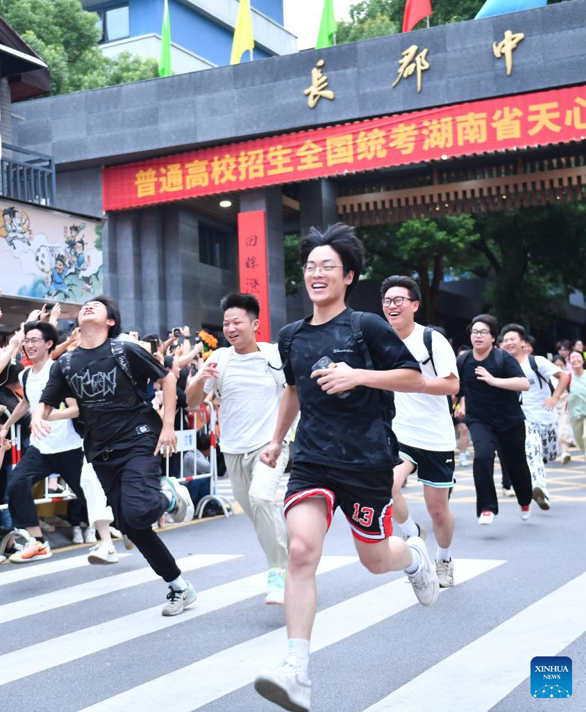 Students run out of a national college entrance examination site in Changsha City, central China's Hunan Province, June 9, 2025. China's national college entrance exam, also known as the gaokao, began on June 7 this year. The exam in some regions has ended on Monday. (Xinhua/Chen Zhenhai)