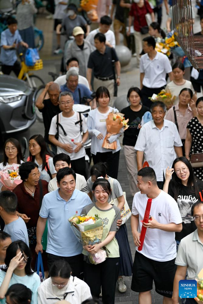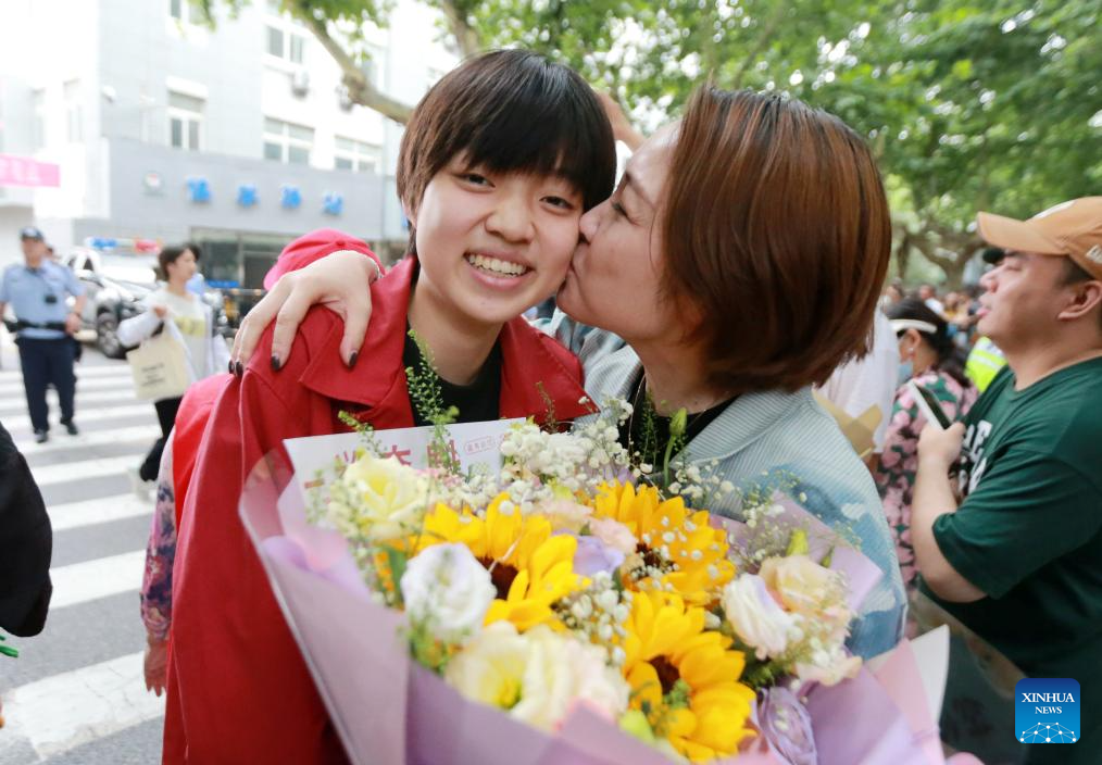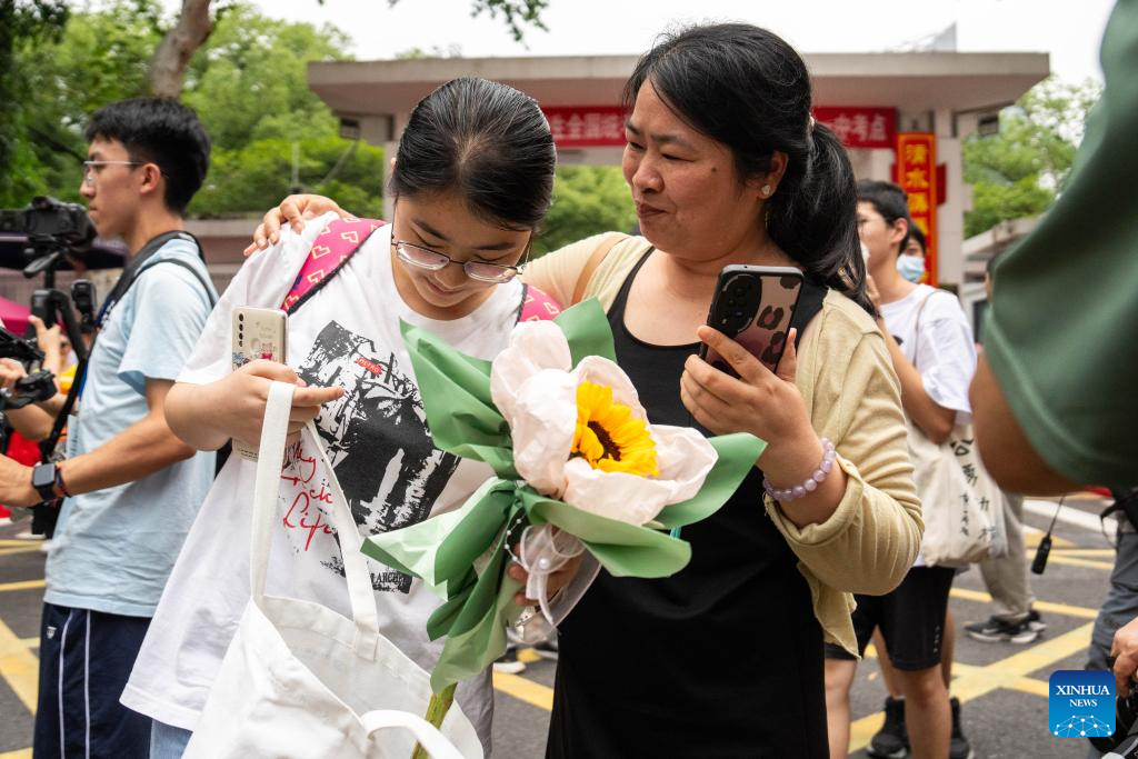 A parent (1st R) welcomes her daughter after the exam at a national college entrance examination site in Changsha, central China's Hunan Province, June 9, 2025. China's national college entrance exam, also known as the gaokao, began on June 7 this year. The exam in some regions has ended on Monday. (Xinhua/Chen Sihan)