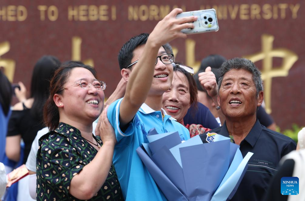A student takes selfies with family members at a national college entrance examination site in Shijiazhuang City, north China's Hebei Province, June 9, 2025. China's national college entrance exam, also known as the gaokao, began on June 7 this year. The exam in some regions has ended on Monday. (Photo by Liang Zidong/Xinhua)