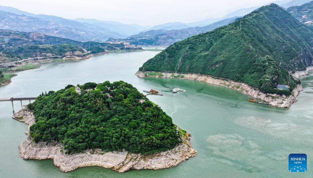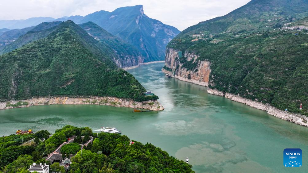 An aerial drone photo shows the summer scenery in Qutang Gorge, one of the Three Gorges on the Yangtze River, in southwest China's Chongqing Municipality, June 9, 2025. (Xinhua/Wang Quanchao)