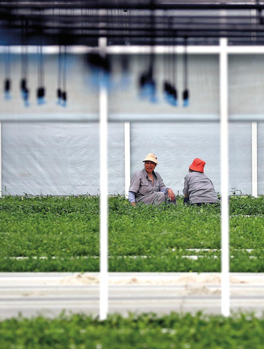 Workers tend tea tree seedlings in a greenhouse at the demonstration park in Lanshan district on May 23. (Chen Zebing/China Daily)