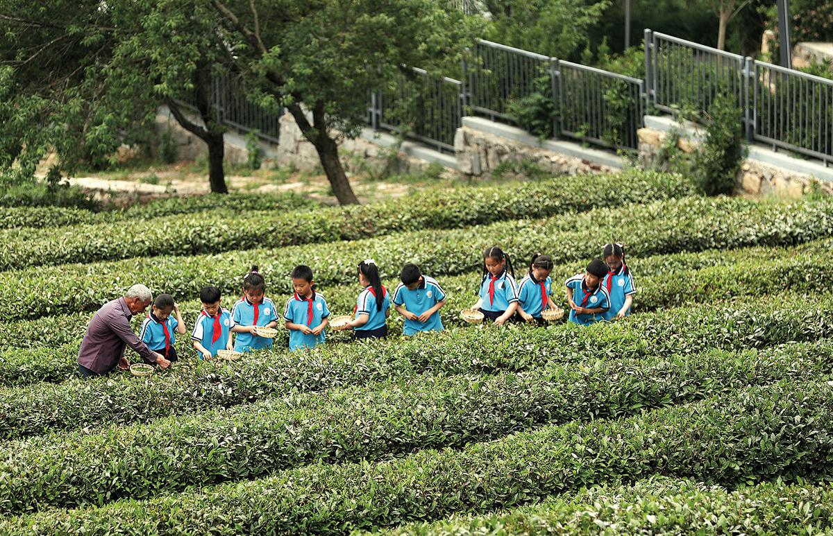 Students learn to pick tea leaves at a plantation in Lanshan district on May 22. (Chen Zebing/China Daily)