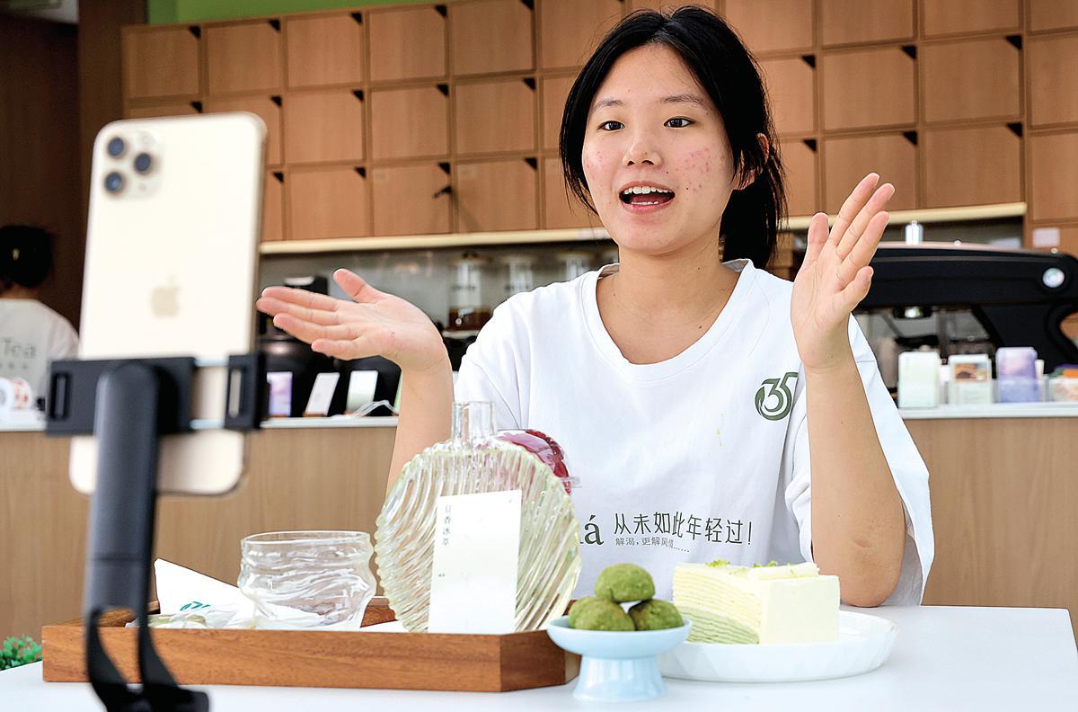 Customers take selfies at a tea shop in Rizhao, Shandong province, on May 25. (Chen Zebing/China Daily)