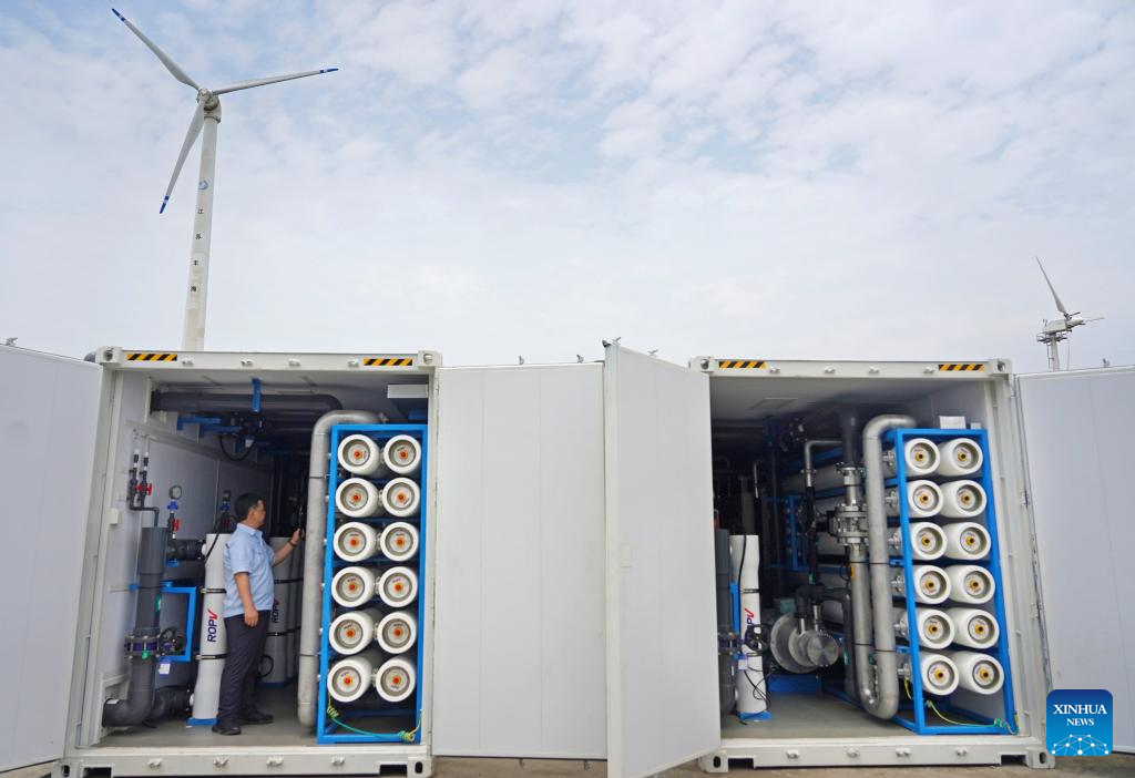 A model seawater desalination solution provider, Jiangsu Fenghai New Energy Seawater Desalination Development Co., Ltd. is committed to the industrialized development of new energy powered desalination technology to convert seawater into freshwater and offers integrated seawater desalination and electricity solutions to islands and areas facing significant water and power shortage. (Xinhua/Wan Xiang)