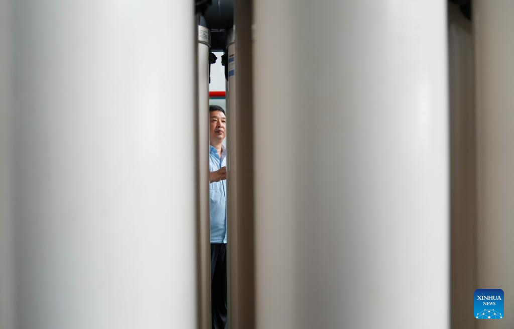 A staff member patrols in a seawater desalination workshop of Jiangsu Fenghai New Energy Seawater Desalination Development Co., Ltd. in Yancheng, east China's Jiangsu Province, June 7, 2025.