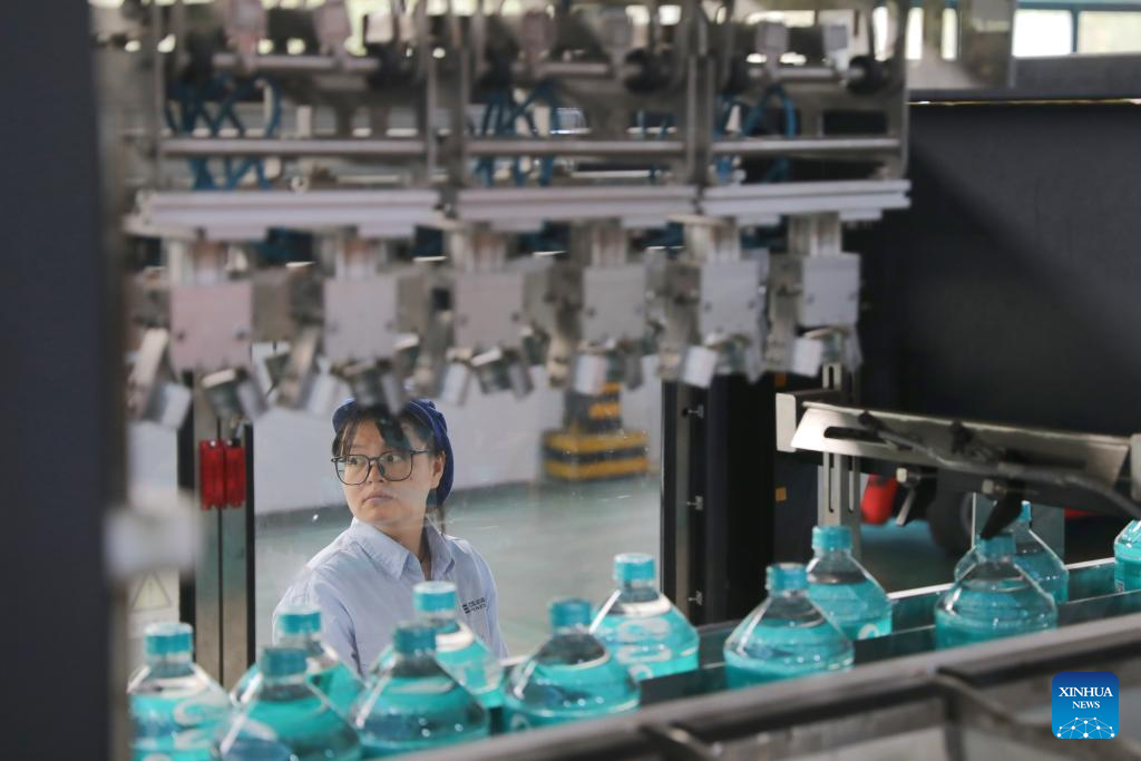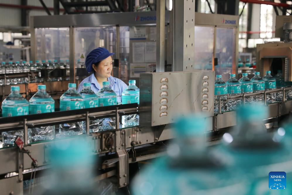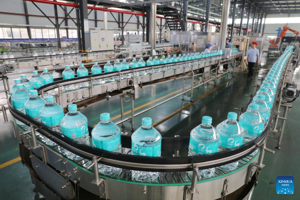 Staff members work at the production line of bottled drinking water in Jiangsu Fenghai New Energy Seawater Desalination Development Co., Ltd. in Yancheng, east China's Jiangsu Province, June 7, 2025.